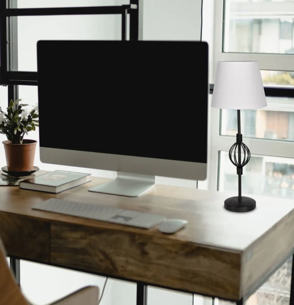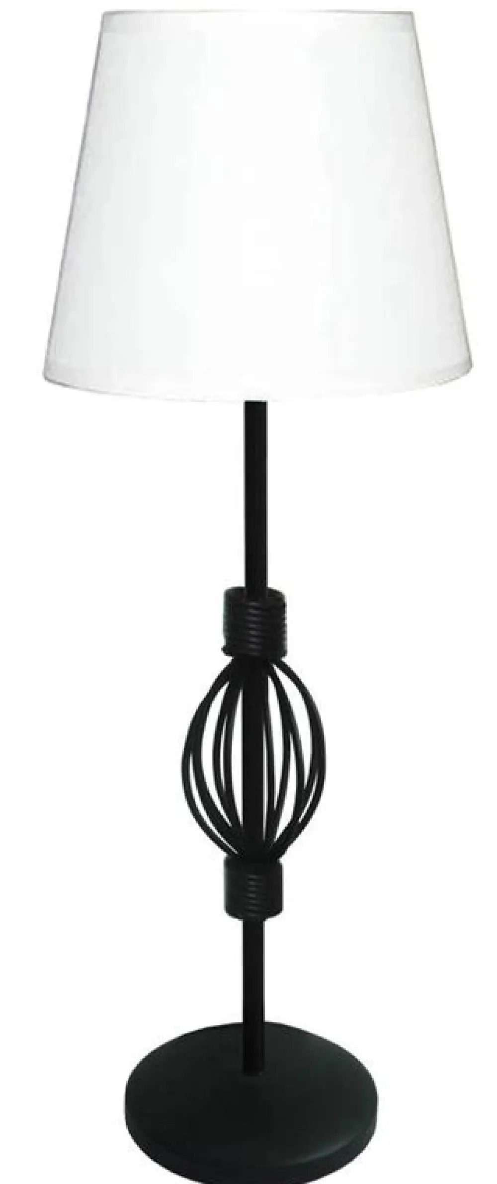 Smukła metalowa podstawa ozdobiona dekoracyjną rozetą, również wykonaną z metalu, połączona ze smukłym abażurem.