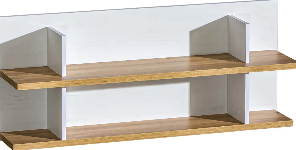 - Półka wisząca SILVA o szerokości 120 cm. Występuje w jednym wybarwieniu łączącym dwa kolory: dąb nash oraz sosna andersen. Całość wykonana z płyty laminowanej o grubości 16 mm. Krawędzie zostały wzmocnione obrzeżem PCV.
