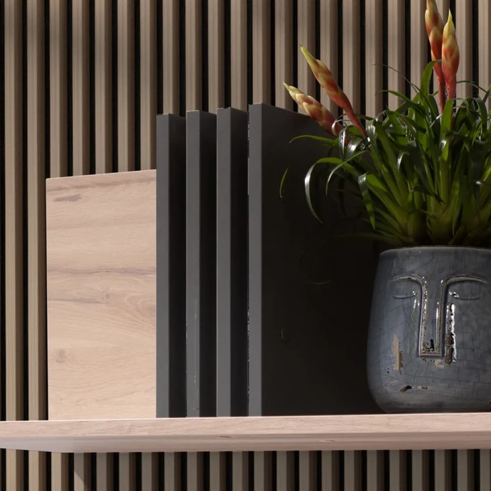 - Zainwestuj w elegancję i funkcjonalność z naszą nowoczesną półką ścienną do salonu AGRA. Świetlisty dąb estana harmonizuje z antracytowymi lamelami, tworząc wyrafinowany kontrast. Idealne miejsce na Twoje ulubione książki, dekoracje, czy zbiory.