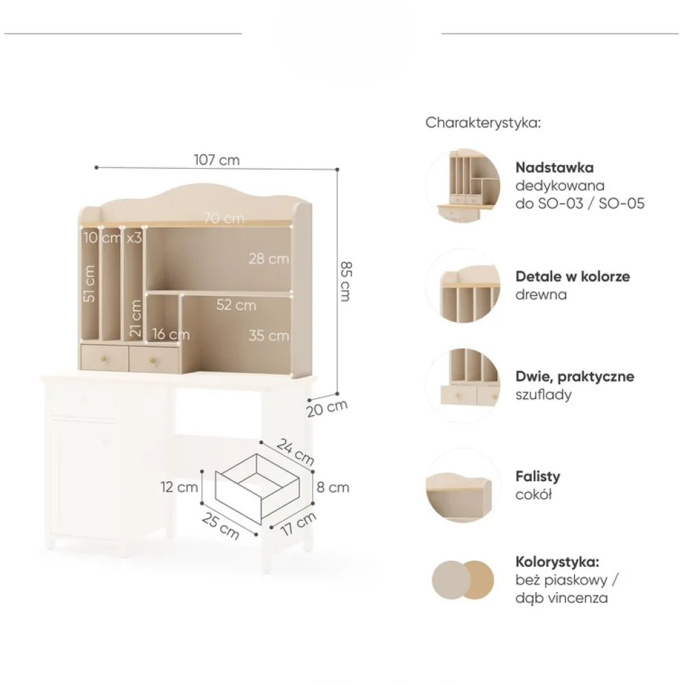 Nadstawka na biurko STORY to praktyczny dodatek, który pozwala maksymalnie wykorzystać przestrzeń roboczą. Wyposażona w trzy otwarte półki oraz dwie wygodne szufladki, sprawia, że wszystkie przybory biurowe, dokumenty i dekoracje zyskują swoje miejsce. Dzięki niej utrzymasz porządek na blacie, a jednocześnie zyskasz dodatkową powierzchnię do przechowywania w estetycznej formie. Beż piaskowy korpus z detalami w dekorze dąb vincenza bielona wprowadza do wnętrza harmonię i naturalny akcent.