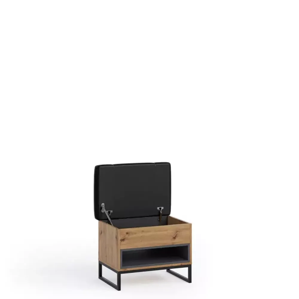 Kuferek posiada siedzisko obite ekoskórą. Sprawdzi się jako schowek z miejscem do siedzenia w pokoju młodzieżowym lub salonie, ale także jako szafka na buty do przedpokoju.