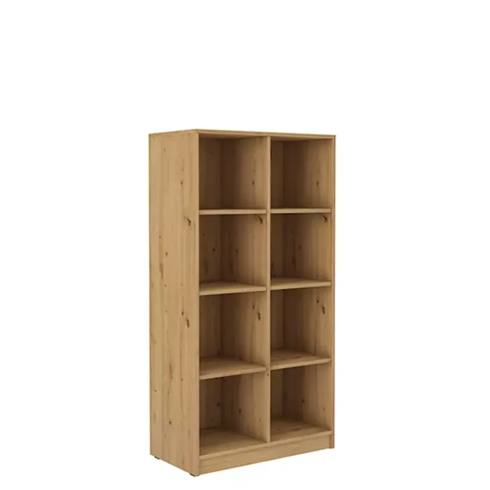 - Wysoki regał do biura ma 79,9 cm szerokości i wyposażono go w sześć półek z płyty laminowanej, które dają osiem wnęk do przechowywania.