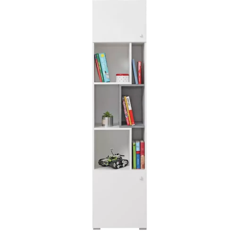 Regał młodzieżowy do pokoju z aż sześcioma wnękami na froncie, które świetnie sprawdzą się jako, przestrzeń dekoracyjna, którą zaaranżujecie swoimi ulubionymi pamiątkami, ozdobami lub fotografiami rodzinnymi. Dwie dodatkowe szafki bez półek znajdują się na górze i na dole.