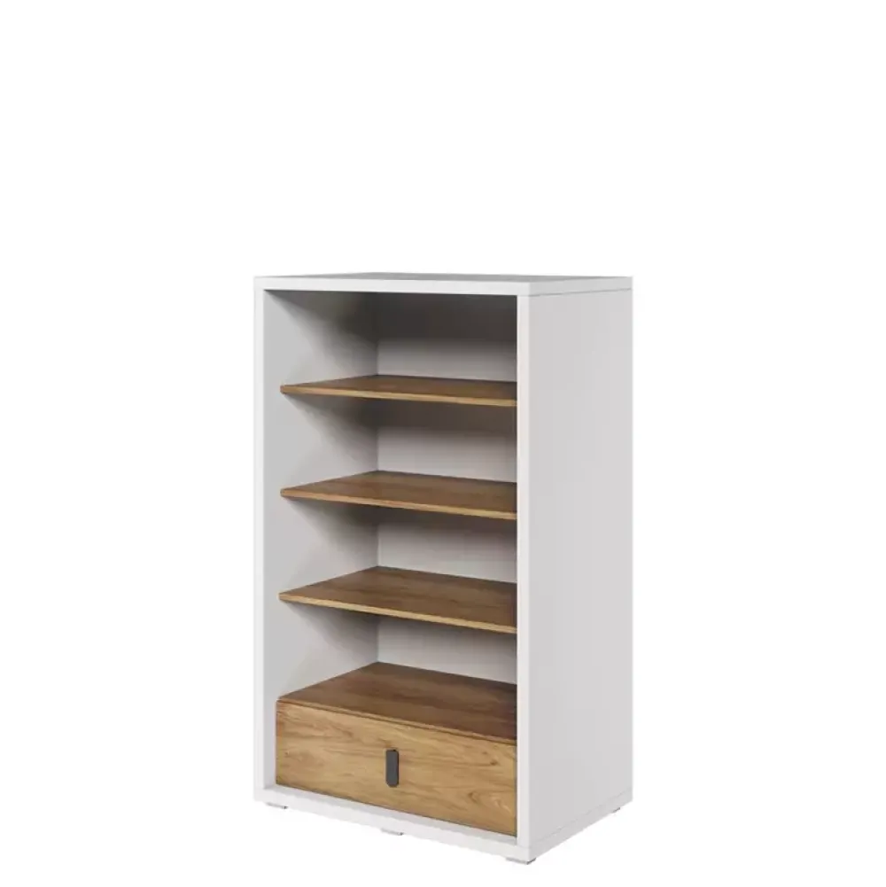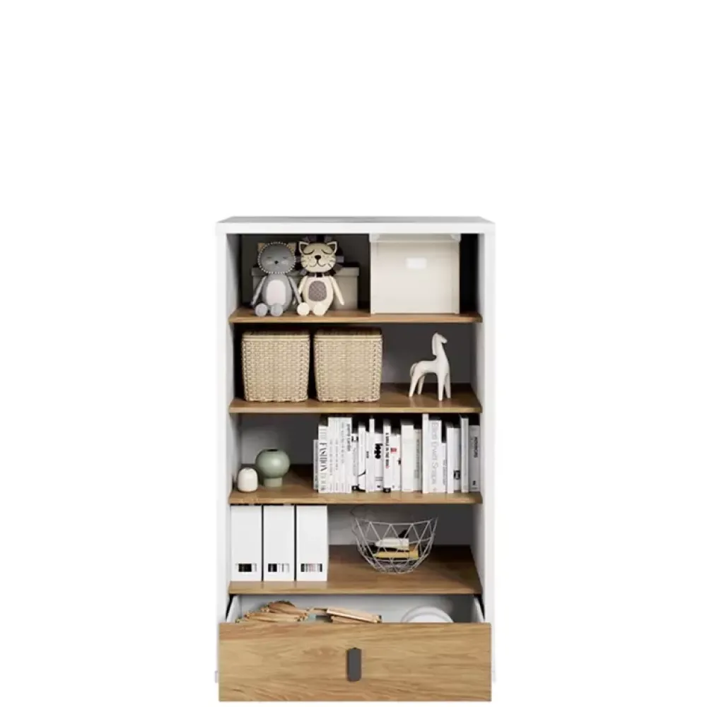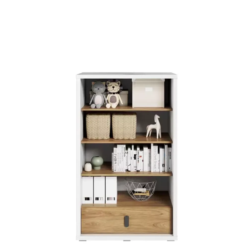 Regał do pokoju dziecięcego SIMI został wyposażony w trzy półki, które doskonale sprawdzą się do umieszczenia książek oraz rozmaitych akcesoriów w postaci dekorów oraz książek. Regał dziecięcy posiada również szufladę osadzoną na prowadnicach kulkowych, która znajduje się u dołu. Dodatkowo uchwyt szuflady został wykonany z metalu w czarnym kolorze. Natomiast wykonanie w nowoczesnej stylistyce sprawia, że regał na książki doskonale wpisuje się we współczesne trendy wystroju pokoi dziecięcych.