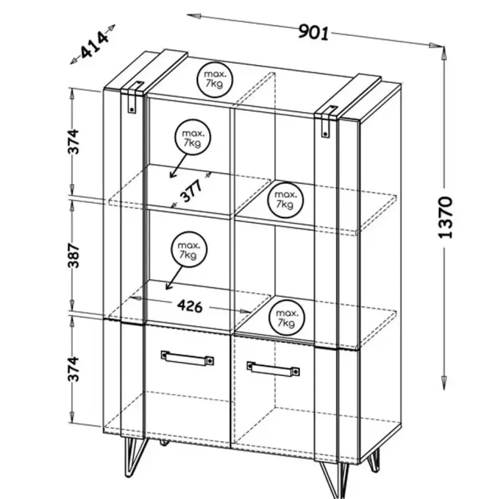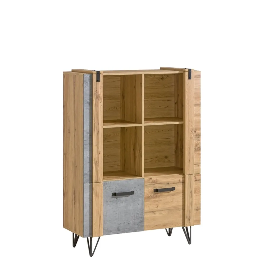 Całość mebla jest podparta przez wysokie, metalowe nóżki. Solidne, lecz subtelne, niewątpliwie dodają regałowi nieco przestrzeni i lekkości. Ich metalowy wykończenie zapewnia kontrast dla głównego korpusu regału, co tworzy zaskakująco nowoczesną mieszankę stylów.