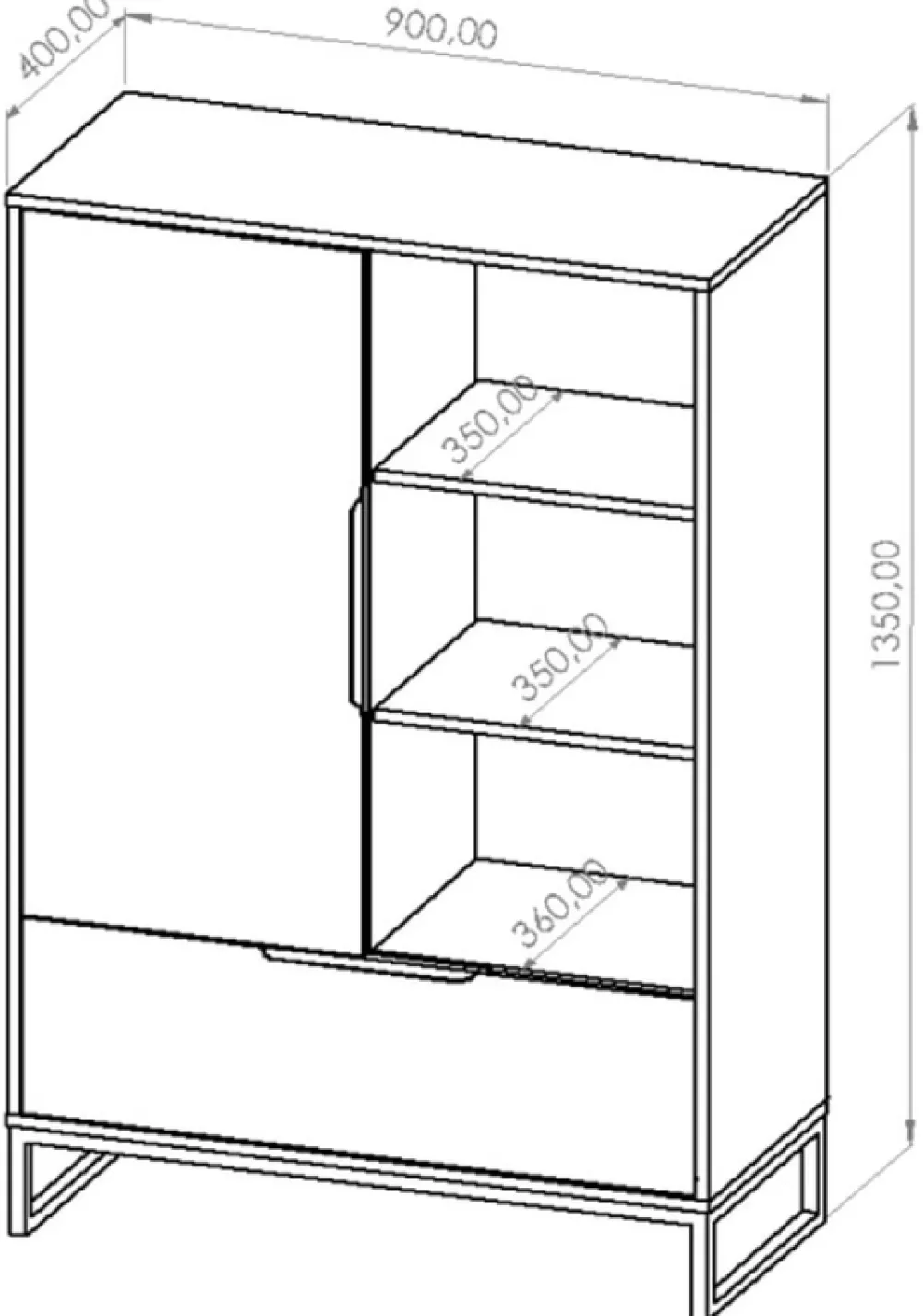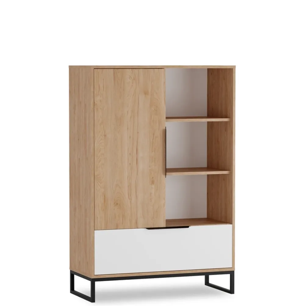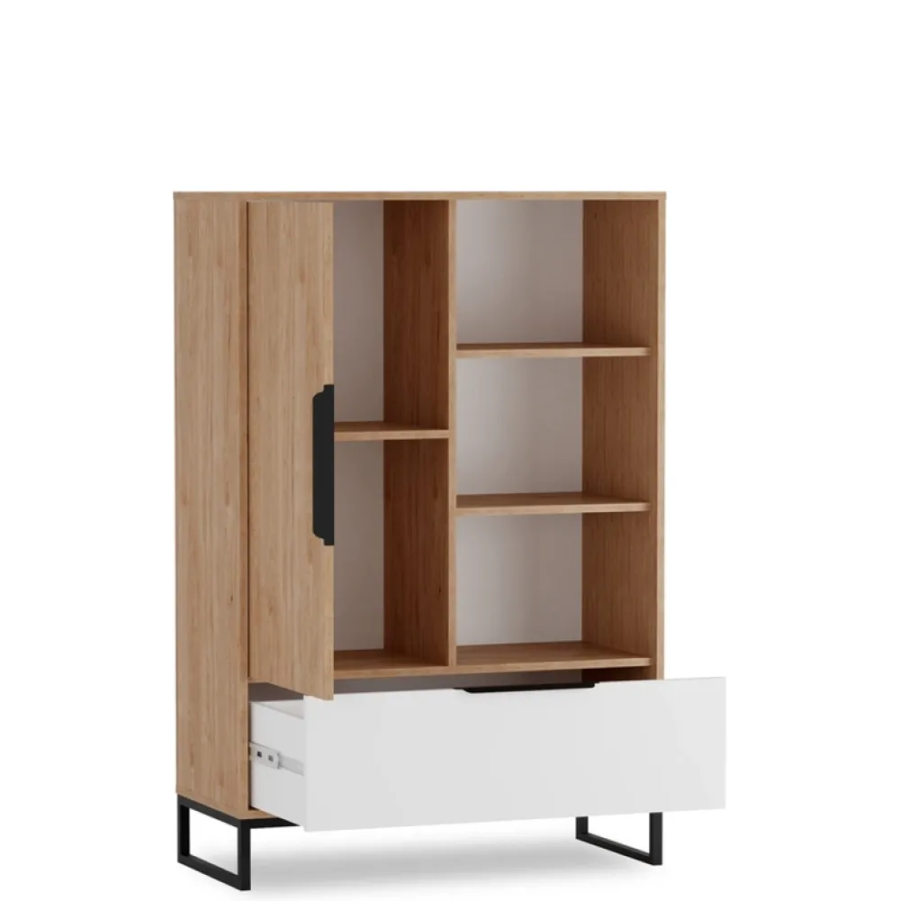 - Regał z półkami LORRO wyposażony jest zarówno w otwarte jak i zamknięte półki. U dołu mebla znajduje się pojemna szuflada poruszająca się na prowadnicach kulkowych. Uchwyty razem z nóżkami wykonane są z metalu w kolorze czarnym.