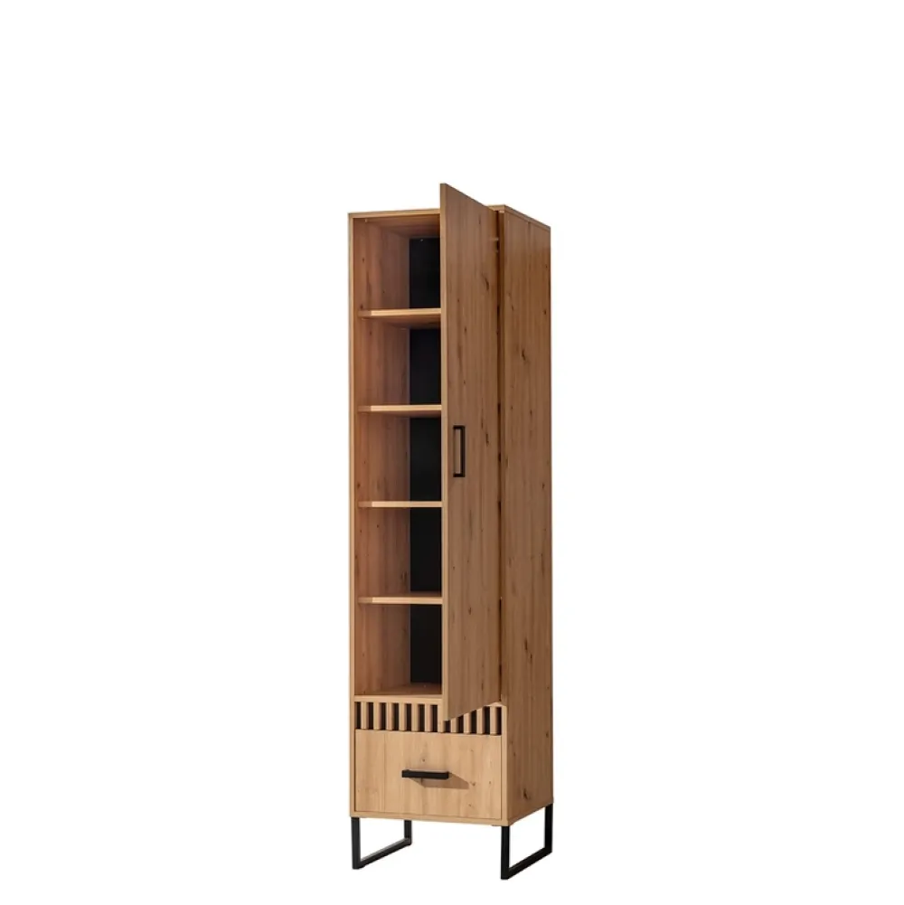 - Twój nowy ulubiony regał LAMELIX czeka. Wyróżnia się dużymi drzwiami, jedną szufladą i eleganckimi czarnymi detalami na tle dębu artisan.