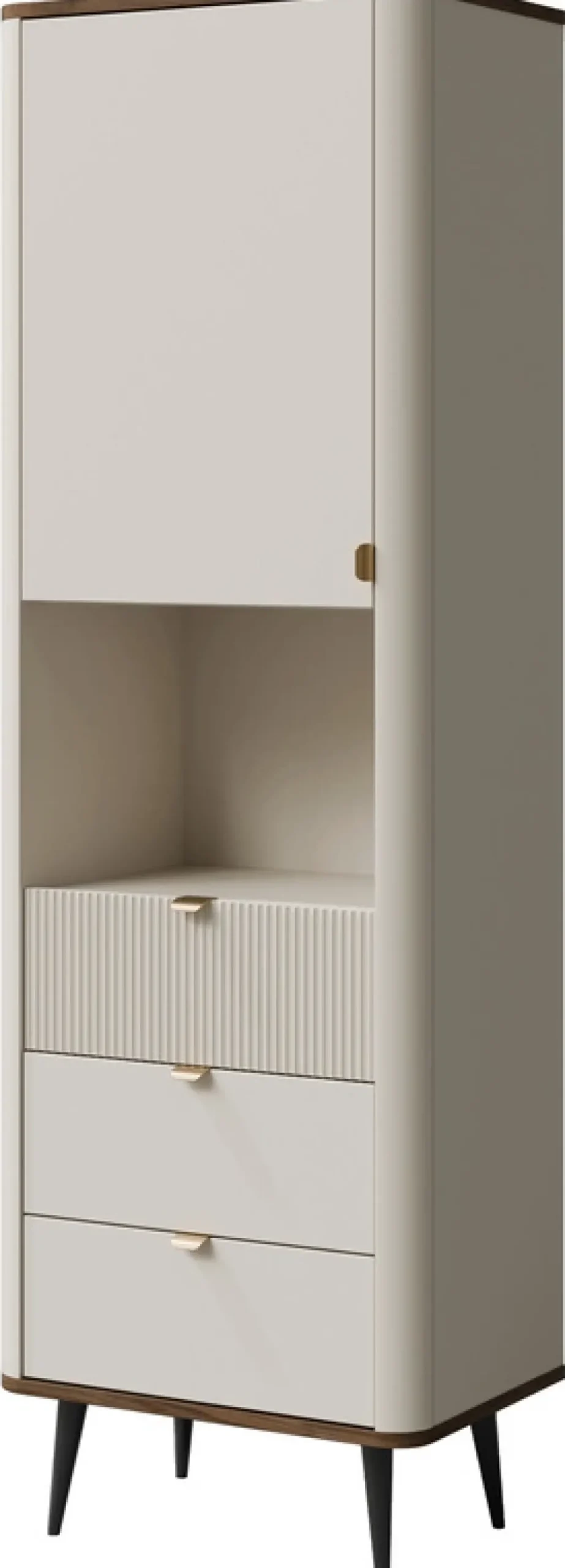 - Regał do salonu MIREL posiada 60 cm szerokości, w skład których wchodzą drzwi z półkami wewnątrz, otwarta przestrzeń na dekoracje oraz trzy pojemne szuflady na bieliznę i akcesoria. Regał stoi na metalowych nóżkach o wysokości 18 cm.