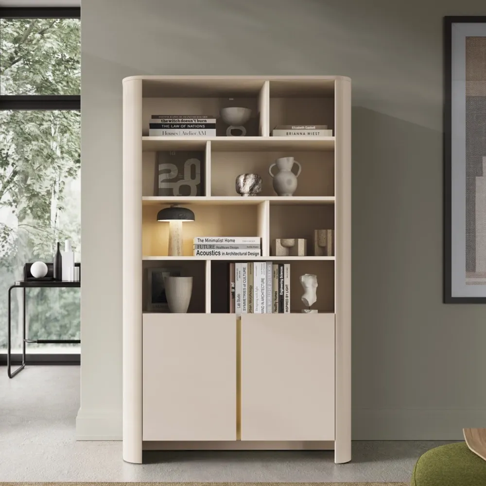 Regał BELVI w kolorze kaszmir to idealna propozycja do salonu, biura lub gabinetu, gdzie liczy się zarówno estetyka, jak i praktyczne przechowywanie. Połączenie delikatnego odcienia kaszmiru tworzy całość, która doskonale wpisuje się w aktualne trendy wnętrzarskie.