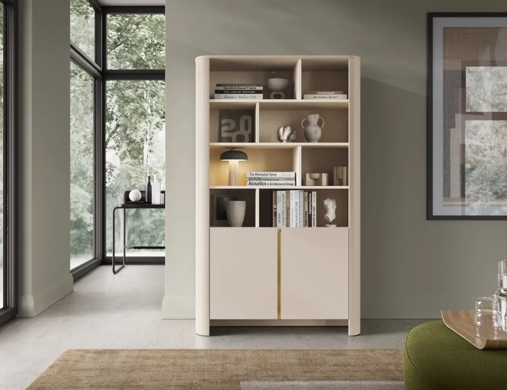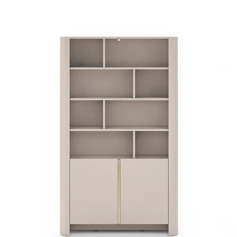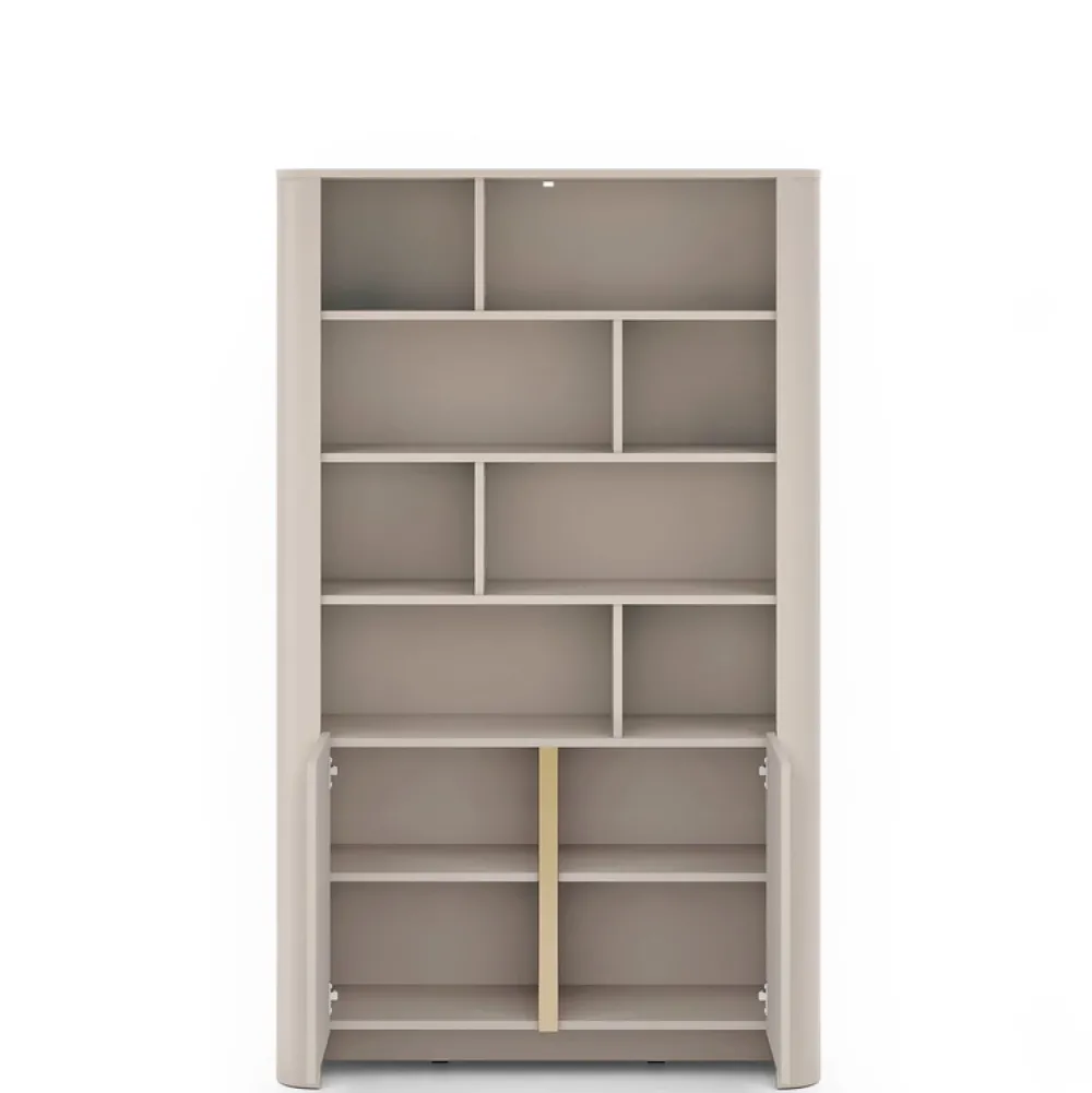 - Regał BELVI w kolorze kaszmir o wymiarach: szerokość (103 cm), wysokość: (170 cm), głębokość: (39 cm) to elegancka i funkcjonalna propozycja z 8 wnękami oraz 2 szafkami dolnymi. System push-to-open, obłe krawędzie i solidna konstrukcja. Idealny do salonu.