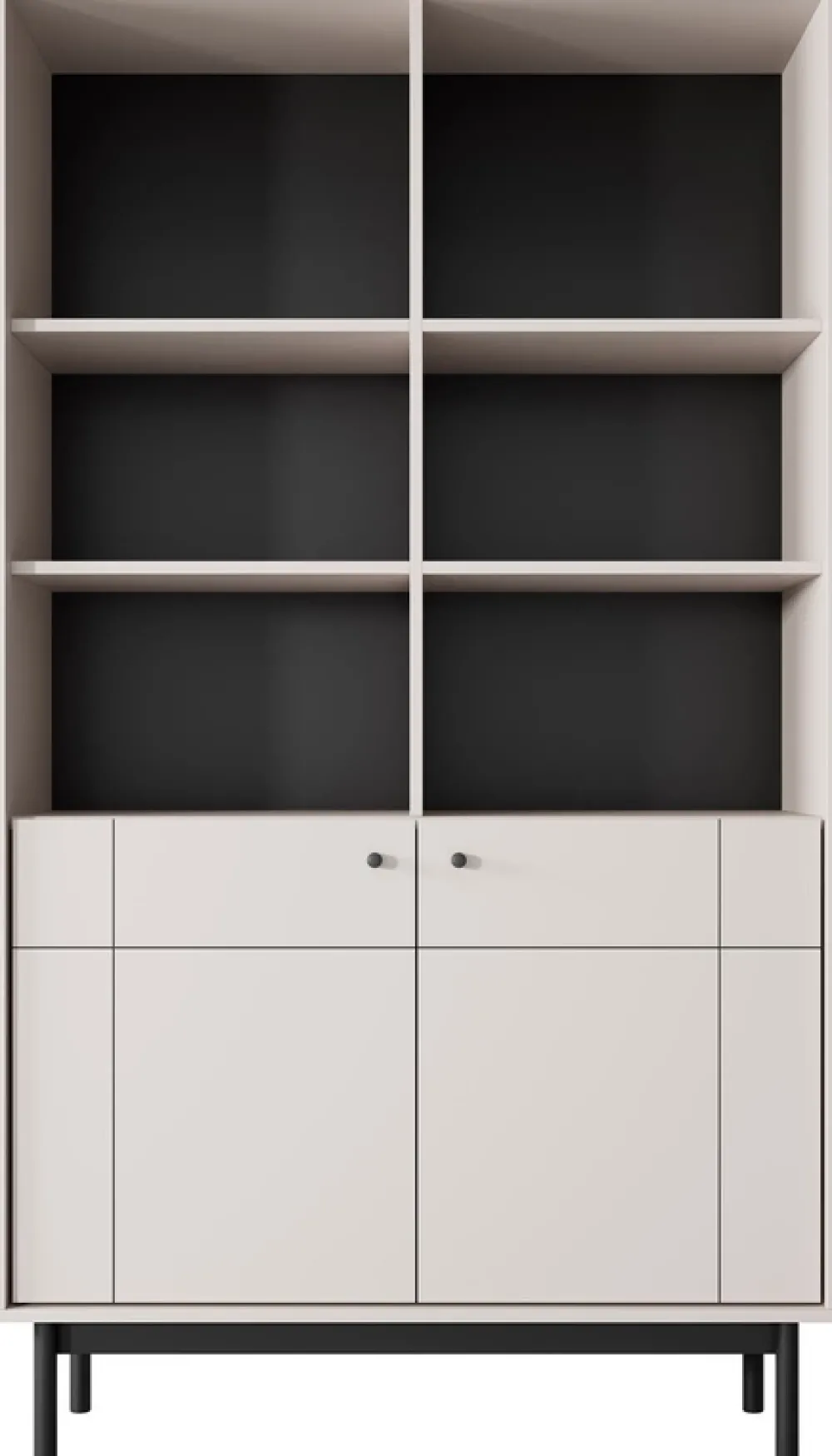 - Regał do salonu 103 cm JUVA posiada sześć otwartych półek na akcesoria i dekoracje oraz cztery półki za drzwiami z systemem cichego domyku . Regał stoi na nóżkach o wysokości 20 cm, które umożliwiają swobodne sprzątanie pod meblem.