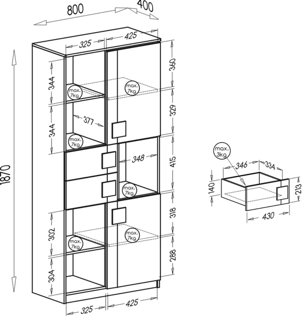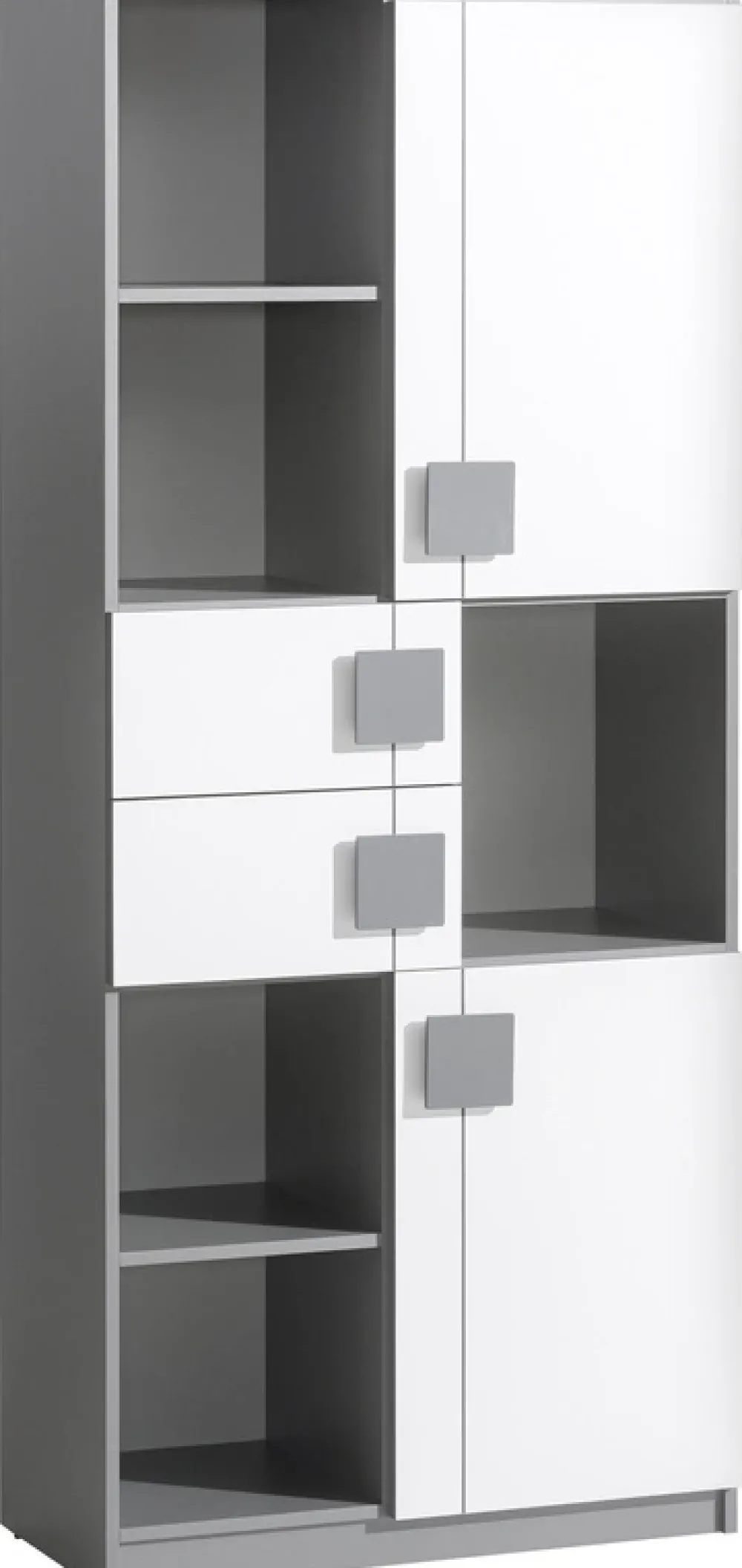 - Regał do pokoju dziecięcego o szerokości 80 cm. Wykonany w całości z płyty laminowanej 16 mm. Krawędzie wzmocnione obrzeżem PCV. Występuje w 1 wybarwieniu łączącym 2 kolory: antracyt i biały brylantowy. Uchwyty i nóżki wykonane z tworzywa sztucznego.