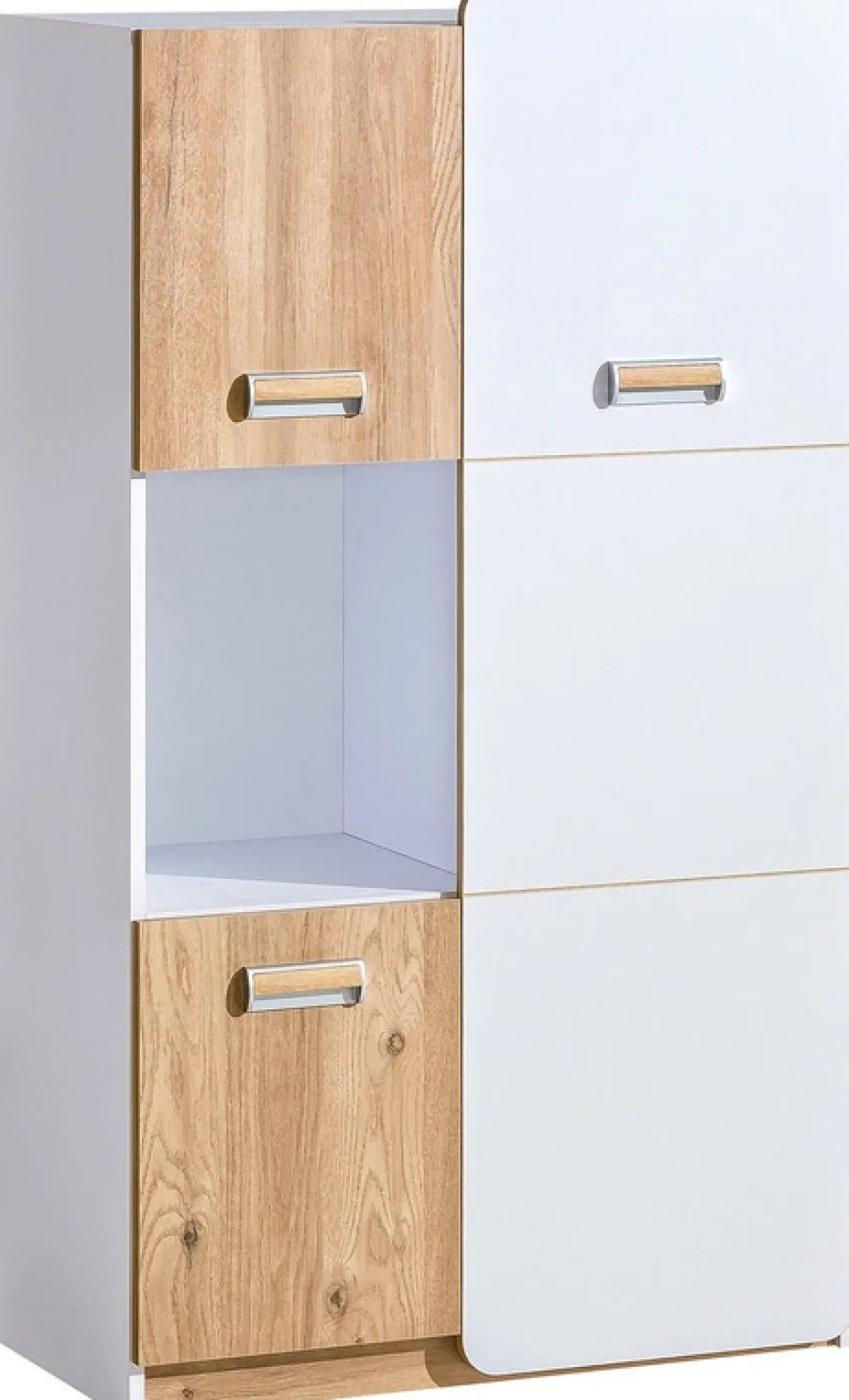 Estetyka regału łączy w sobie dwa eleganckie kolory: dąb nash i biały brylantowy. Ta harmonijna kolorystyka wprowadza do pokoju dziecięcego przytulną, a zarazem nowoczesną atmosferę. Neutralne barwy sprawiają, że mebel będzie pasował do różnorodnych aranżacji i łatwo dopasuje się do zmieniających się preferencji dziecka.