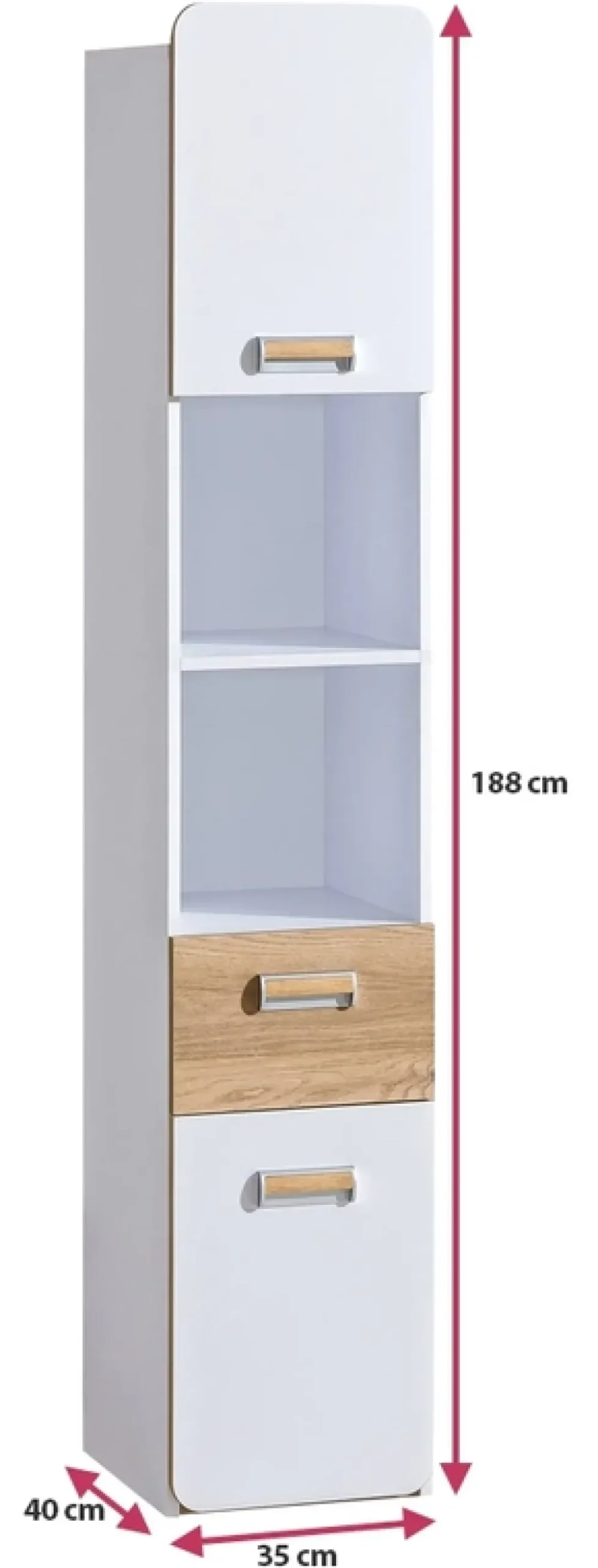 - Nowoczesny regał z szufladą LUMINOUS o szerokości 35 cm. Wyposażony w 1 szufladę oraz 3 półki. Regał wykonany z płyty laminowanej 16 mm. Krawędzie zabezpieczone obrzeżem PCV. Ten wariant posiada wybarwienie łączące 2 kolory: dąb nash oraz biały brylantowy