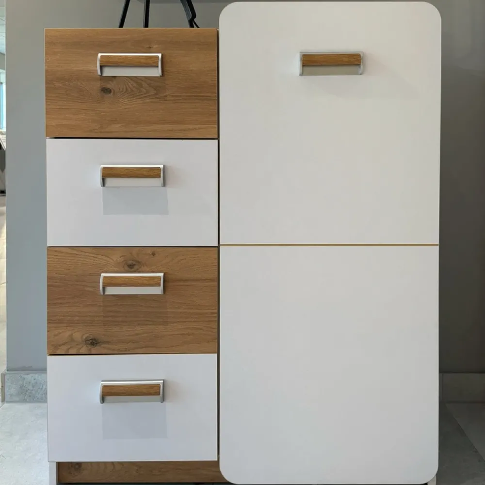 Kolorystyka mebla to przemyślane połączenie dębu nash z białym brylantowym, co tworzy przytulną, a zarazem nowoczesną atmosferę. Ta paleta barw doskonale komponuje się z różnorodnymi aranżacjami, dodając wnętrzu ciepła i elegancji.