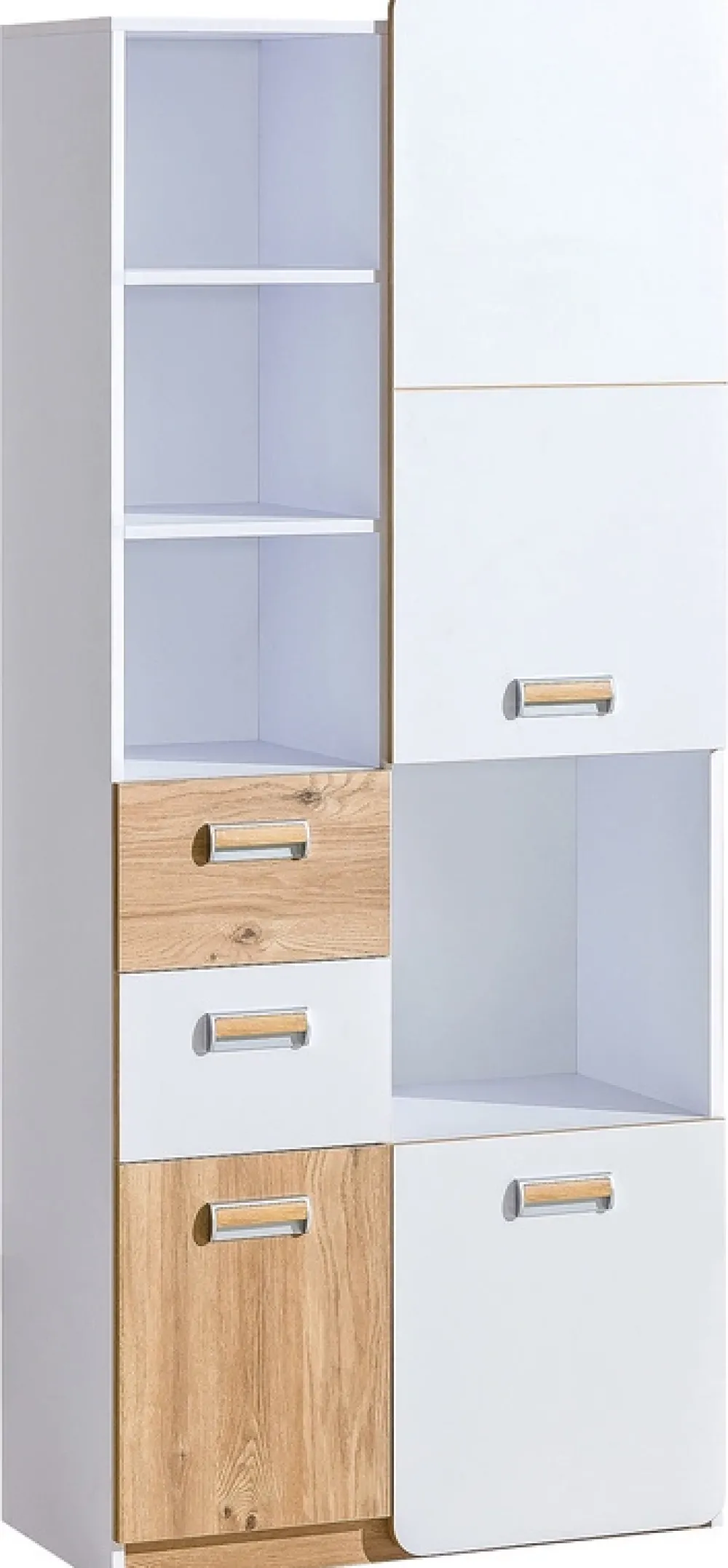 - Regał LUMINOUS o szerokości 80 cm został wyposażony w 2 szuflady oraz 6 półek. Wykonany z płyty laminowanej 16 mm. Krawędzie zabezpieczone obrzeżem PCV. Ten wariant występuje w wybarwieniu łączącym dwa kolory: dąb nash oraz biały brylantowy.