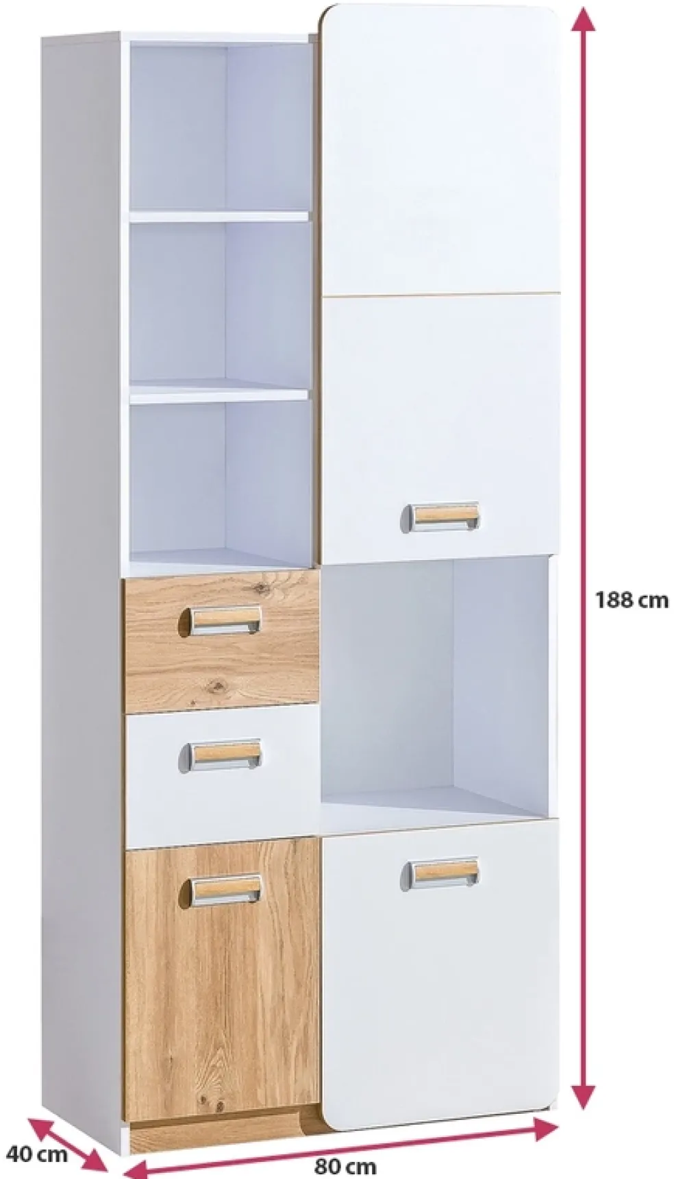 Regał charakteryzuje się optymalnymi wymiarami: szerokość wynosi 80 cm, co pozwala na łatwe umieszczenie go nawet w mniejszych pomieszczeniach, wysokość 188 cm zapewnia dużą przestrzeń pionową na różnorodne przedmioty, a głębokość 40 cm gwarantuje stabilność oraz funkcjonalność bez zajmowania cennej przestrzeni w pokoju. Tak przemyślane wymiary czynią go idealnym rozwiązaniem do każdej przestrzeni dziecięcej, zachęcając maluchy do porządkowania i wykorzystywania przestrzeni wokół siebie.