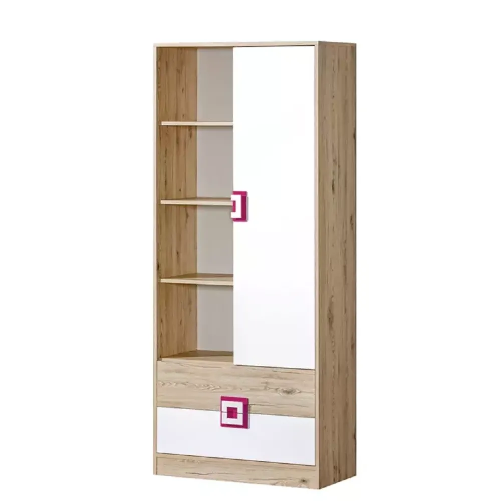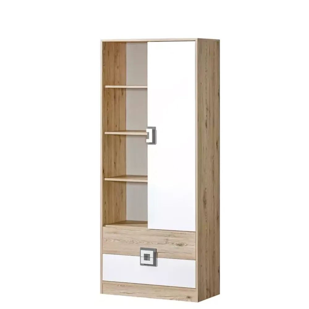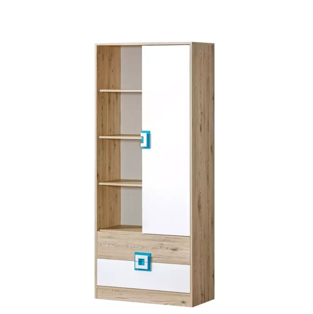Nowoczesny regał z szufladami o szerokości 80 cm z kolekcji NICO. Regał zawiera cztery otwarte poziomy po lewej stronie, na których możemy zagospodarować miejsce na nasze książki. Po prawej stronie znajdziemy drzwi, a za nimi trzy półki gdzie zagospodarujemy je osobistymi akcesoriami czy ubraniami. Na dole miejsce znalazły dwie pojemne szuflady z pełnym wysuwem.