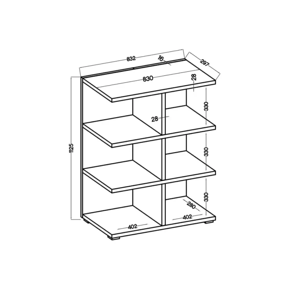 - Otwarty regał wyposażony w cztery półki zapewni Ci miejsce na ulubione książki, czasopisma, czy pamiątki z rodzinnych wakacji. Regał ma 83,2 cm szerokości i 112,5 cm wysokości.