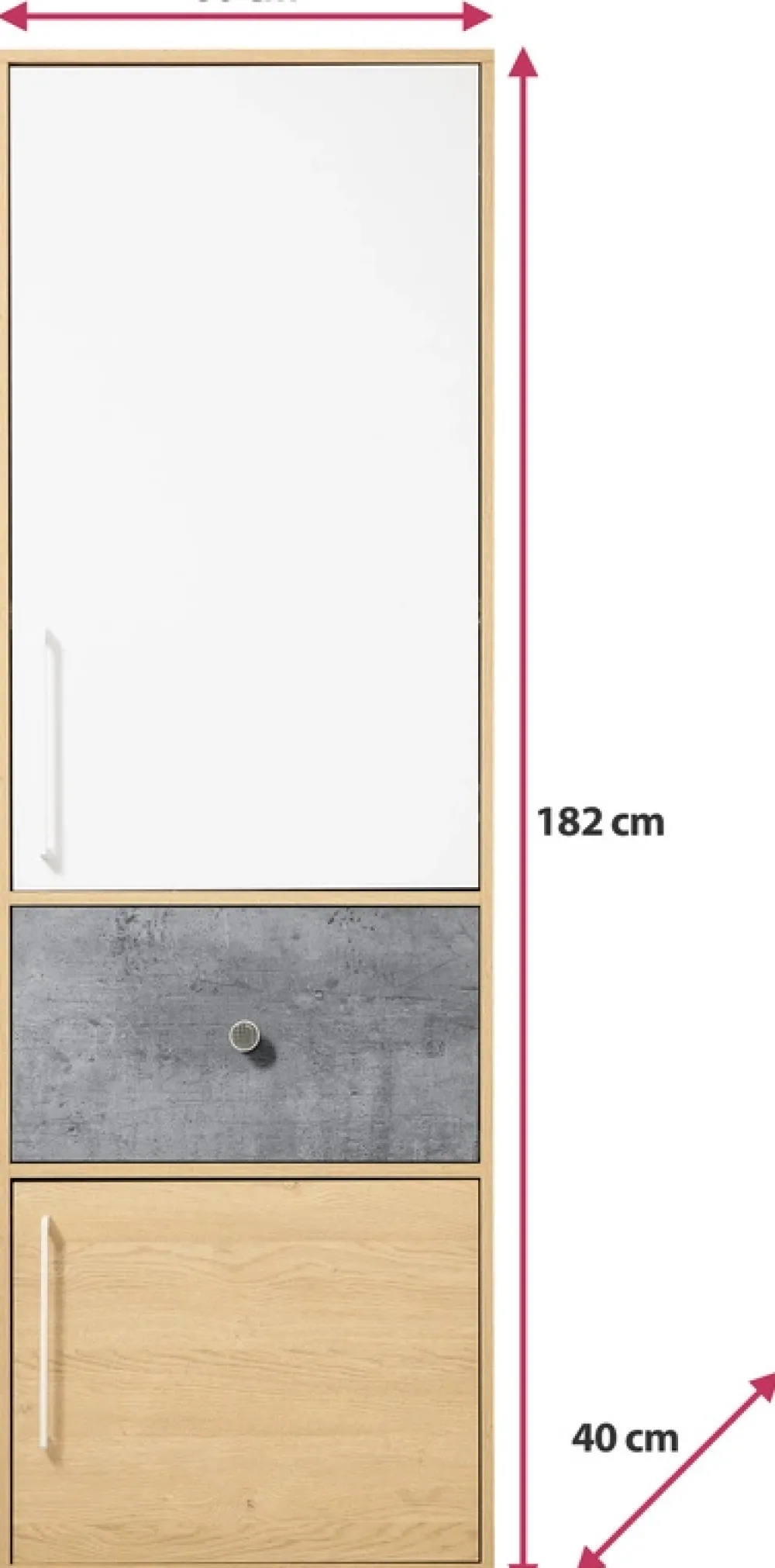 - Regał SLEEK o szerokości 60 cm, wyposażony w jedną przestronną szufladę to jeden z najważniejszych mebli potrzebnych do umeblowania pokoju naszego dziecka. Występujący w jednym wybarwieniu łączącym trzy kolory: Dąb biszkopt, biały lux i beton