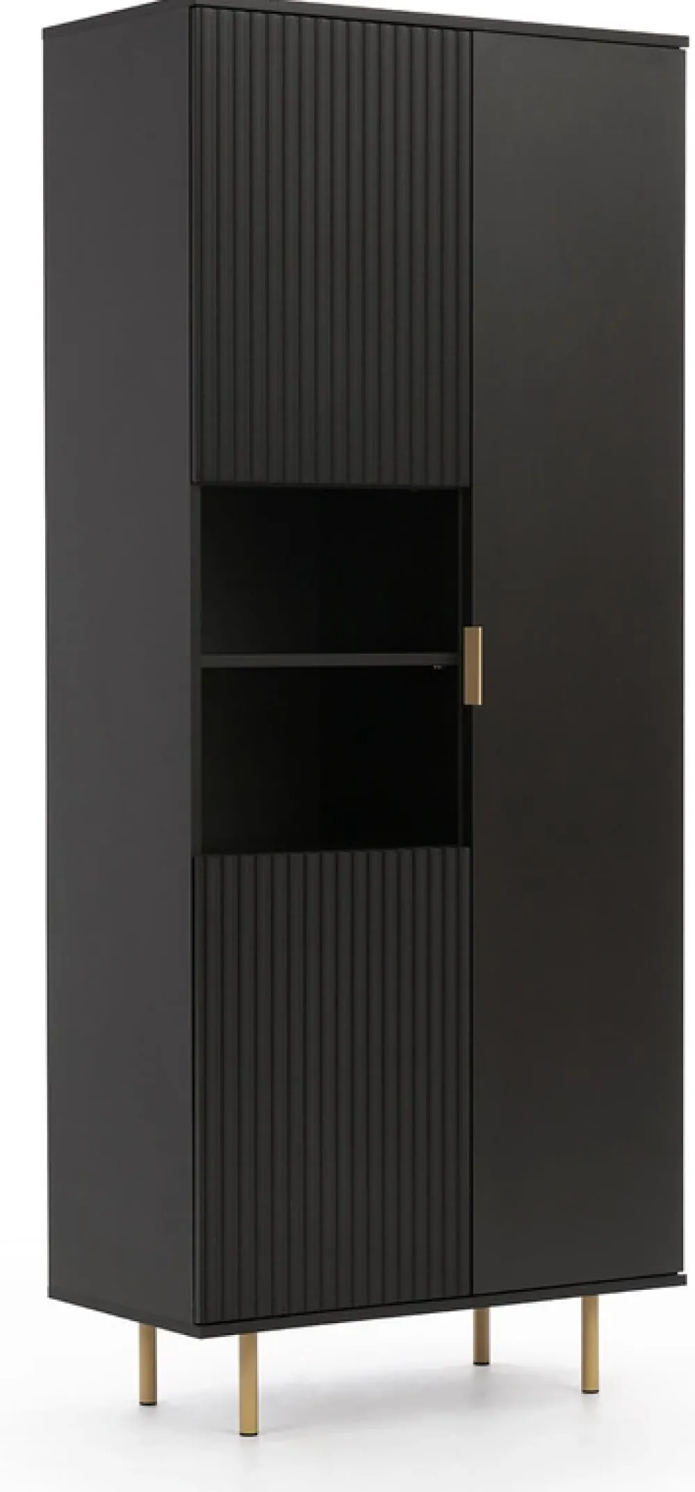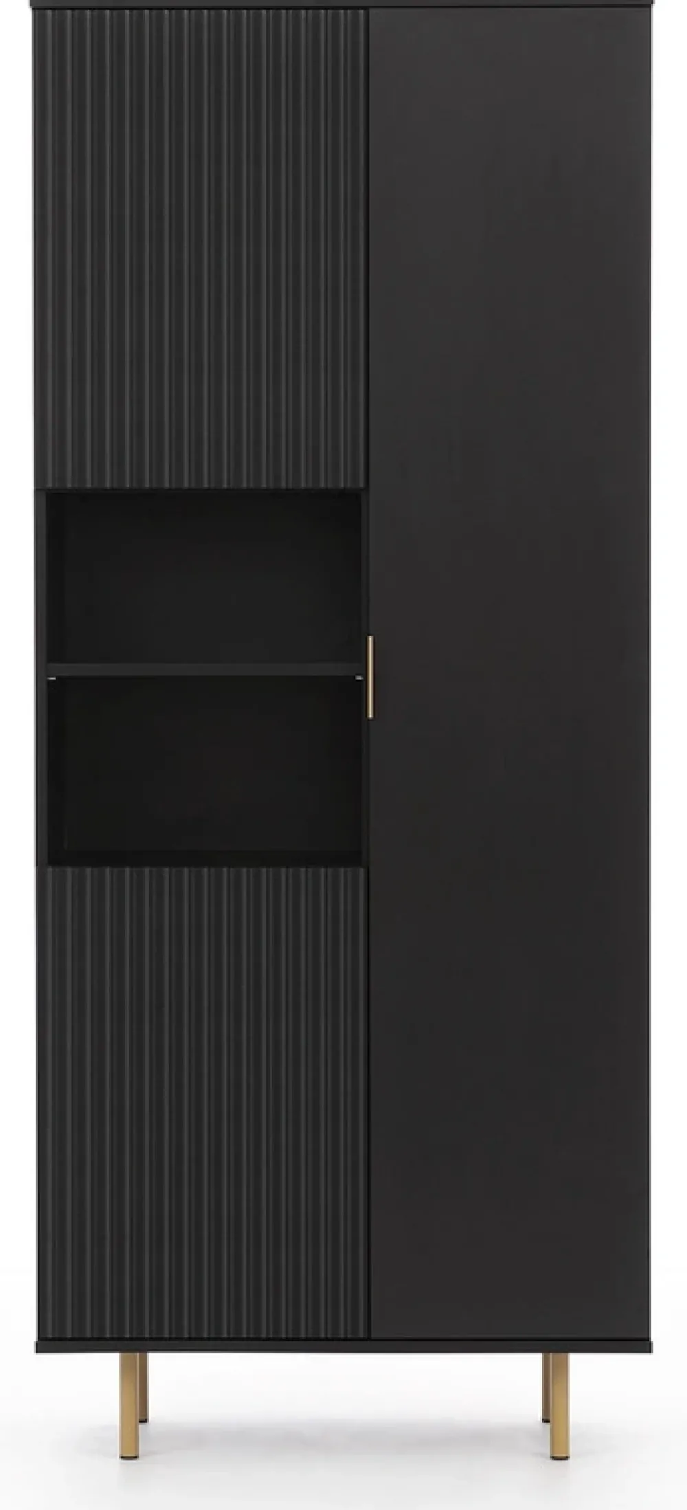 - Ryflowane drzwi regału wykonane zostały z płyty MDF, a także otwierają się za pomocą „mechanizmu push to open”.