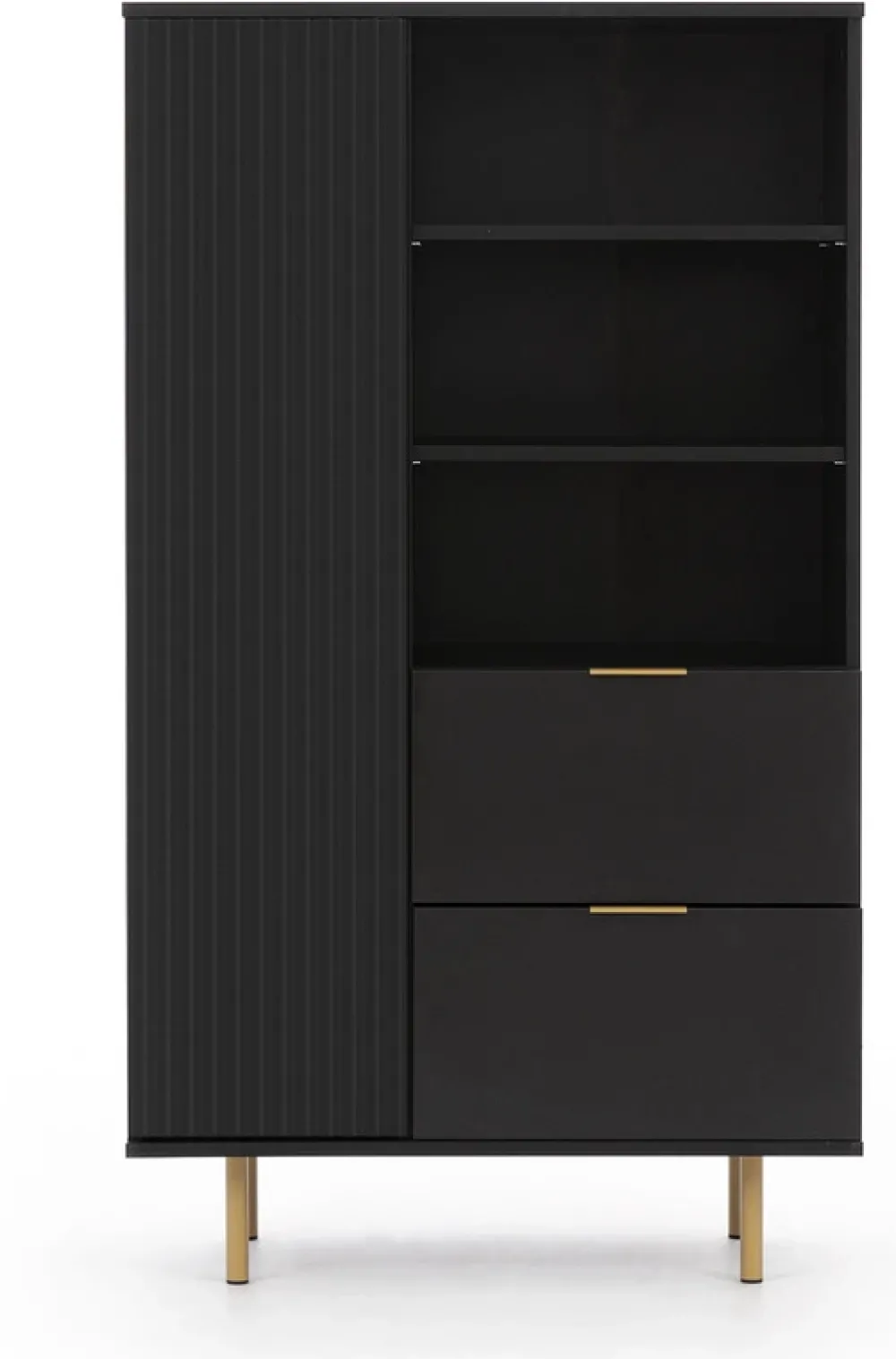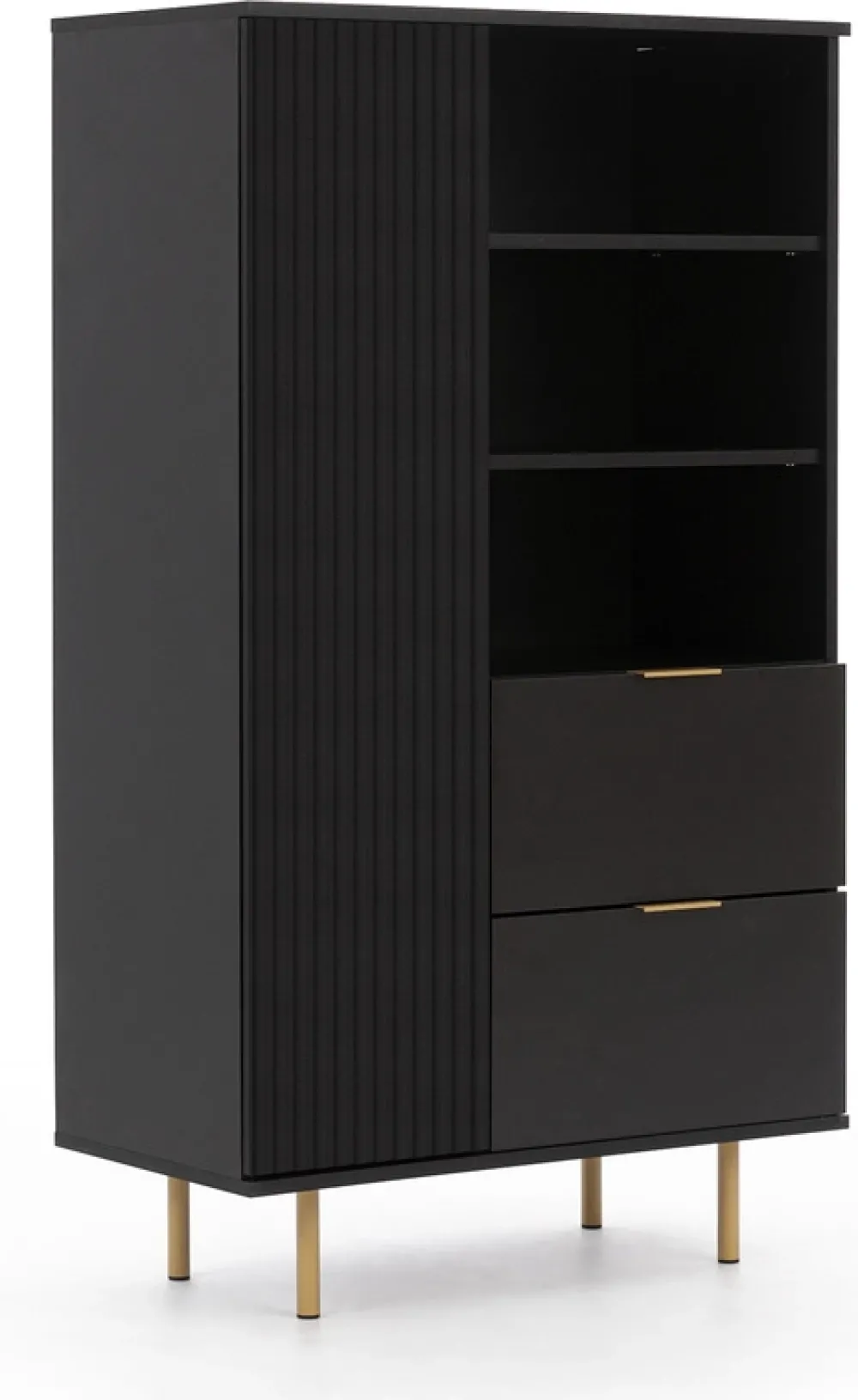 - Ryflowane drzwi regału wykonane zostały z płyty MDF, a także otwierają się za pomocą „mechanizmu push to open”.