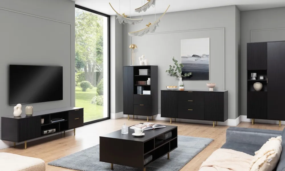 Regał w czarnym kolorze to ponadczasowe i uniwersalne rozwiązanie. Komponuje się on z różnorodnymi paletami barw i motywami dekoracyjnymi.