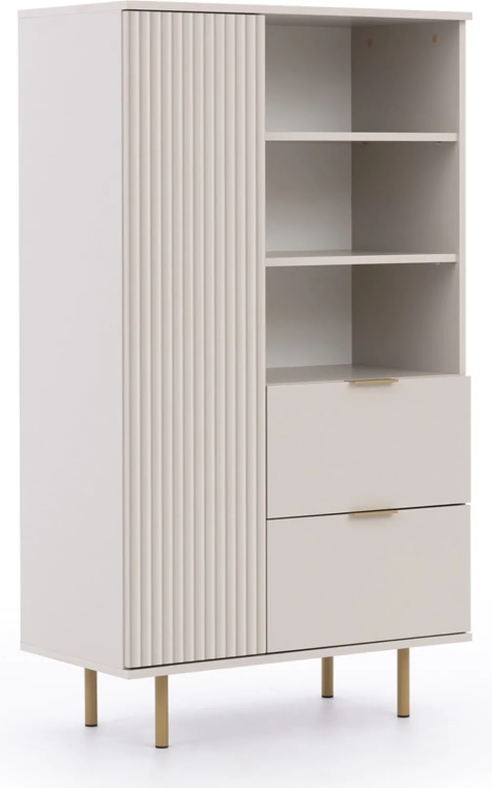 - Ryflowane drzwi regału wykonane zostały z płyty MDF, a także otwierają się za pomocą „mechanizmu push to open”.