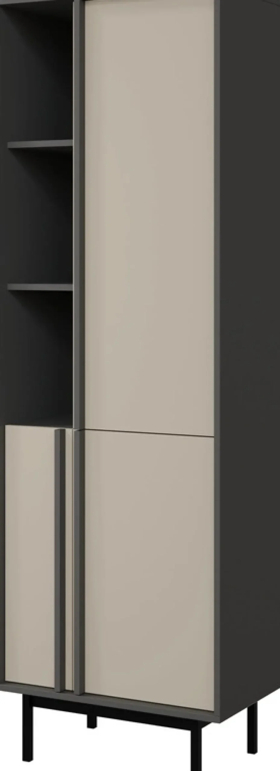 - Nowoczesny wysoki regał w eleganckim zestawieniu kolorystycznym antracytu i jasnego beżu. Wyposażony w praktyczne otwarte półki oraz pojemne szafki zamykane drzwiami, zapewnia dużo miejsca do przechowywania. Idealny do salonu, sypialni czy domowego biura.