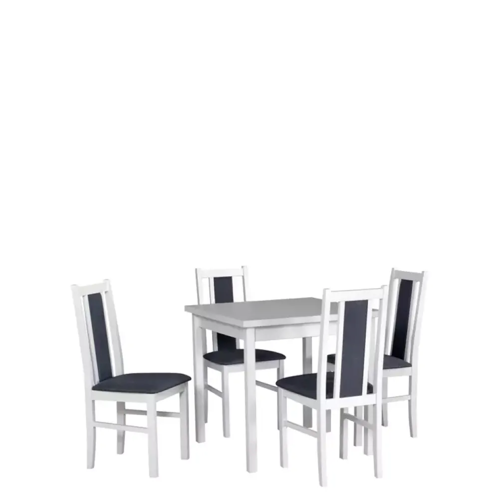 - Zestaw do jadalni z kolekcji MOTTA składa się z czterech krzeseł wyposażonych w tapicerowane siedzisko i oparcie oraz stołu. Zestaw świetnie sprawdzi się we współczesnych aranżacjach, nadając pomieszczeniu lekkości.