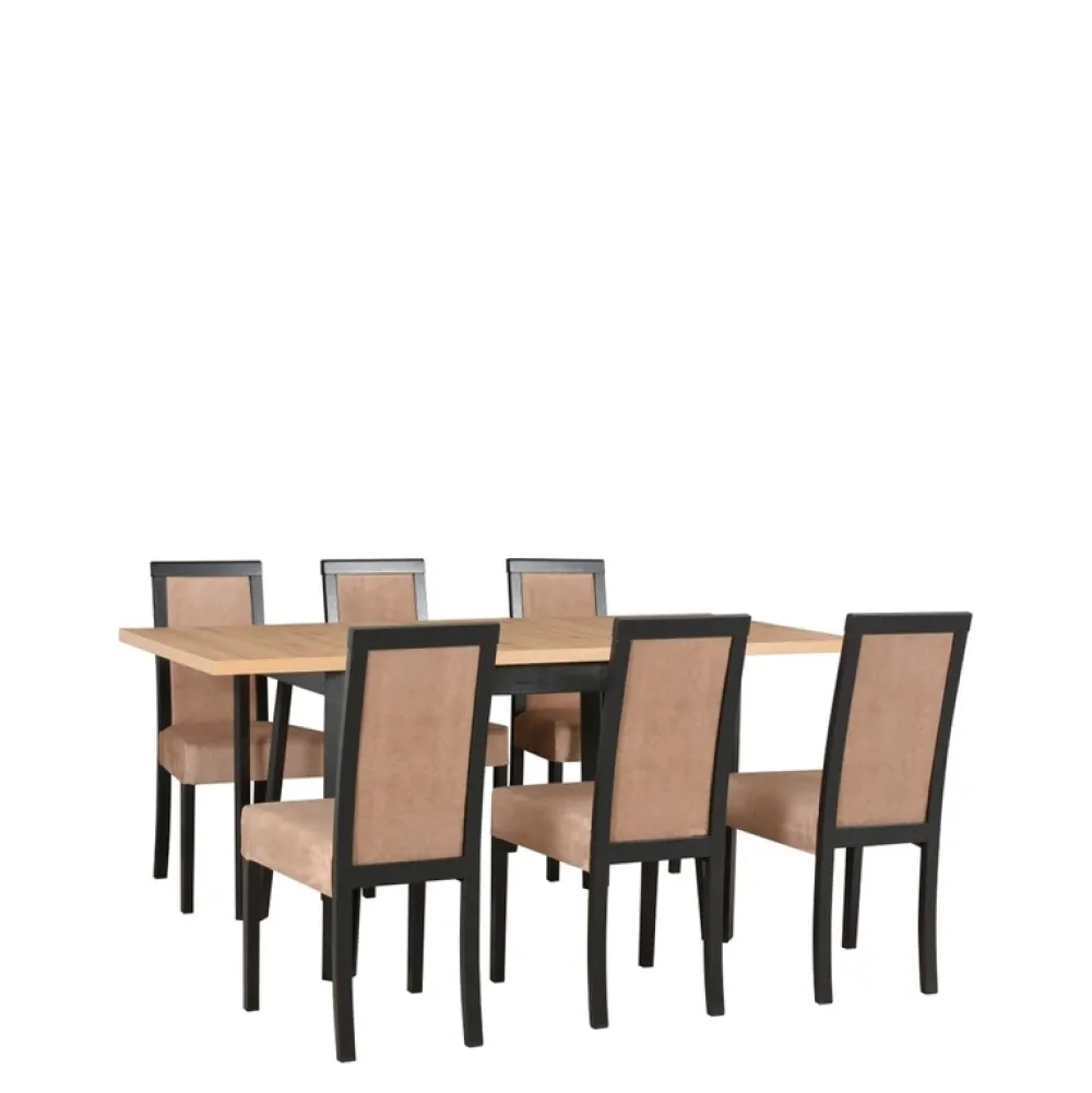 To, co sprawia, że ten zestaw wyróżnia się na tle innych, to sześć tapicerowanych krzeseł. Wygodne oparcie i miękkie siedzisko gwarantują komfort na najwyższym poziomie. A dzięki wielu dostępnym tkaninom, możesz dostosować je dokładnie do swojego stylu i charakteru wnętrza.