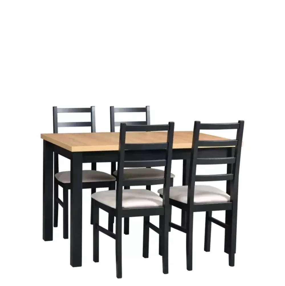Zestaw jadalniany z kolekcji MOTTA składa się ze stołu oraz czterech krzeseł. Stół który znalazł miejsce w zestawie został wyposażony w funkcję rozkładania, która pozwoli ci zwiększyć długość blatu stołu ze 120 do 150 cm. Same krzesła to nowoczesna propozycja, wyposażona w tapicerowane siedzisko wykonane z wysokiej jakości materiałów. Do produkcji stołu i krzeseł, wykorzystano naturalne okleiny oraz drewno bukowe, dzięki czemu możemy ukazać naturalne piękno i strukturę materiału. W związku z wykorzystaniem naturalnych materiałów w stołach mogą występować naturalne różnice, takie jak usłojenie czy różnice odcieni drewna, będące cechami potwierdzającymi naturalne pochodzenie materiału.