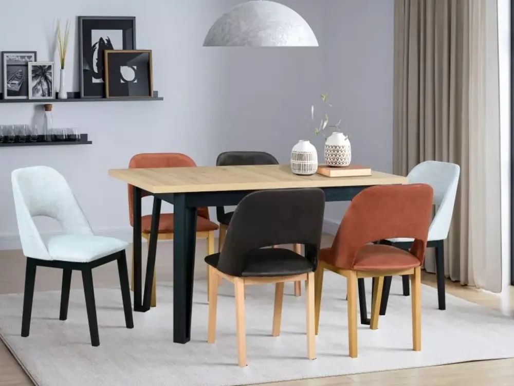 - W zestawie znajduje się sześć tapicerowanych krzeseł tkaniną welurową w widocznych na wizualizacji kolorach.