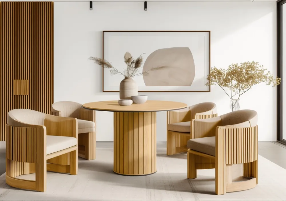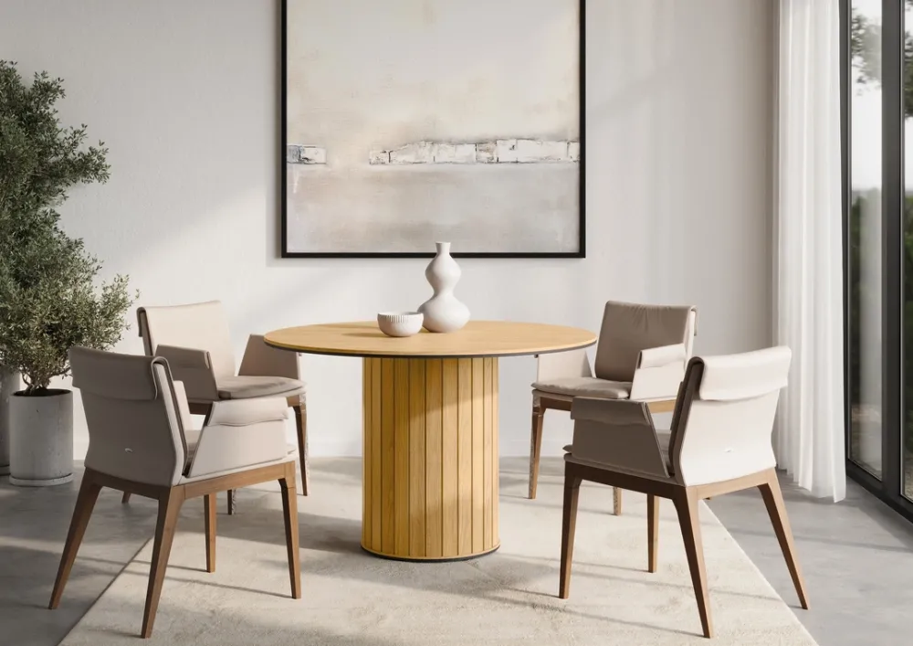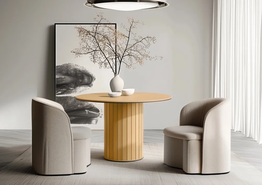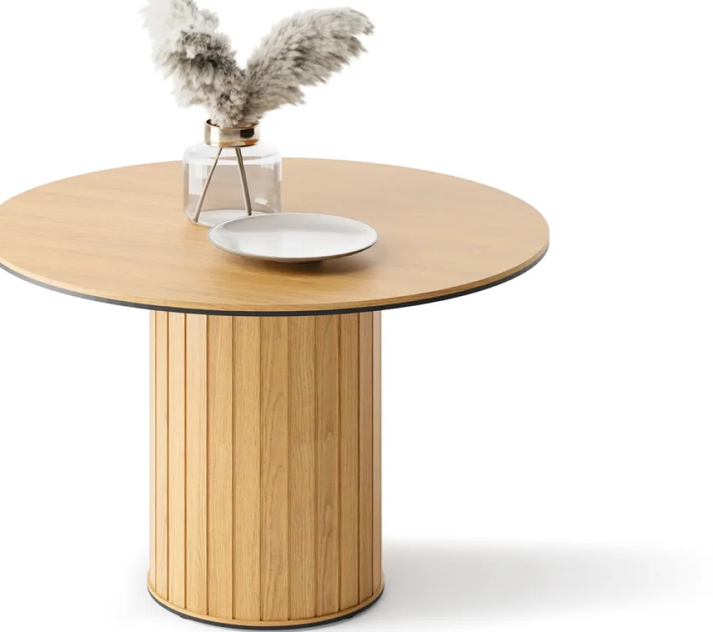 Okrągły stół do jadalni LENART to kwintesencja spokoju i elegancji w duchu japandi – stylu łączącego japońską prostotę z nordycką funkcjonalnością. Blat w odcieniu dąb Vincenza i dekoracyjne lamele na cylindrycznej nodze tworzą ciepły, przytulny klimat, sprzyjający wspólnym posiłkom i rozmowom. Idealny dla 4–5 osób, doskonale sprawdzi się zarówno w nowoczesnych, jak i klasycznych wnętrzach.