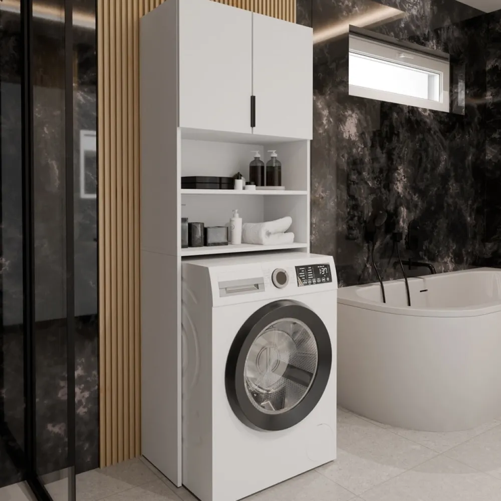 - Biała szafka nad pralkę bez blatu to praktyczne rozwiązanie do łazienki lub pralni. Ma dwie otwarte półki i szafkę z drzwiczkami, czarne uchwyty oraz trwałą konstrukcję z płyty laminowanej 16 mm. Idealna do małych wnętrz.