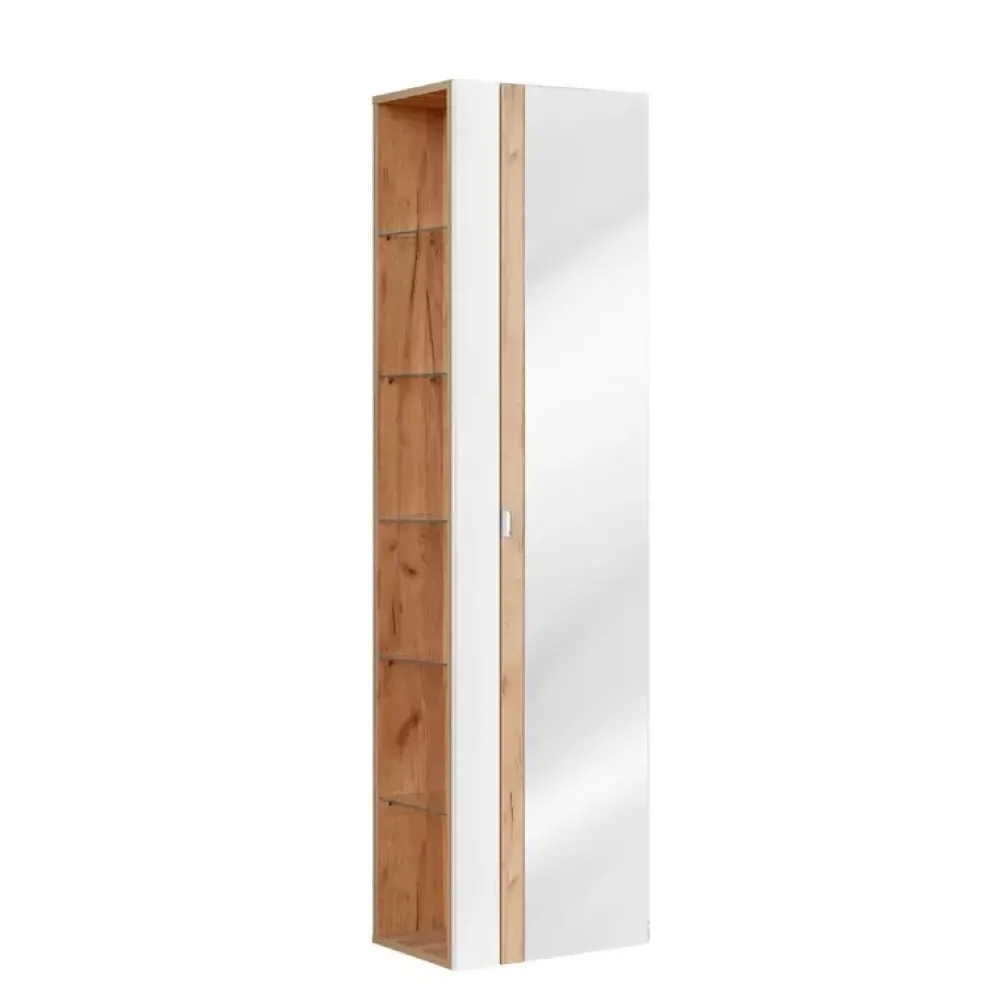 - Wysoka szafka łazienkowa z lustrem na froncie dużych drzwi. Jeden z boków zaaranżowano na pięć półek wiszących ze szkła hartowanego.