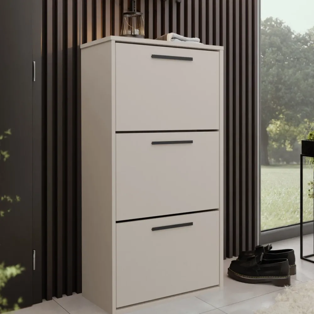 - Szafka na buty ANVER w kolorze kaszmir ma 3 uchylne fronty z półkami, które mieszczą kilkanaście par obuwia. Głębokość 24 cm sprawia, że idealnie nadaje się do wąskich korytarzy. Wykonana z płyty 16 mm z okleiną PCV, z czarnymi uchwytami.