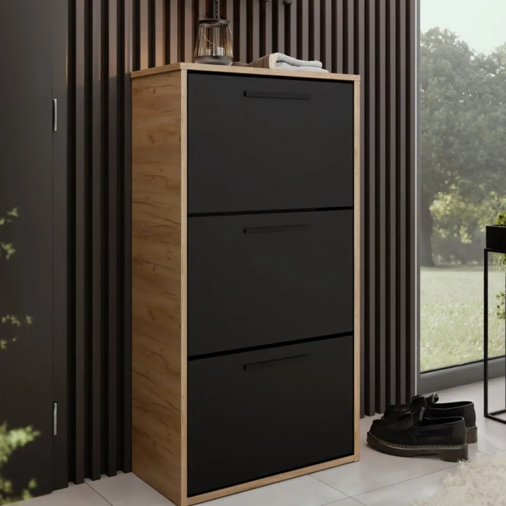 Szafka na buty ANVER z korpusem w dekorze dąb craft złoty i eleganckimi czarnymi frontami to doskonały wybór do wnętrz w stylu nowoczesnym, loftowym lub skandynawskim. Praktyczna konstrukcja z trzema uchylnymi frontami i sześcioma przegródkami zapewnia miejsce na wiele par obuwia, nie zajmując przy tym dużo przestrzeni.