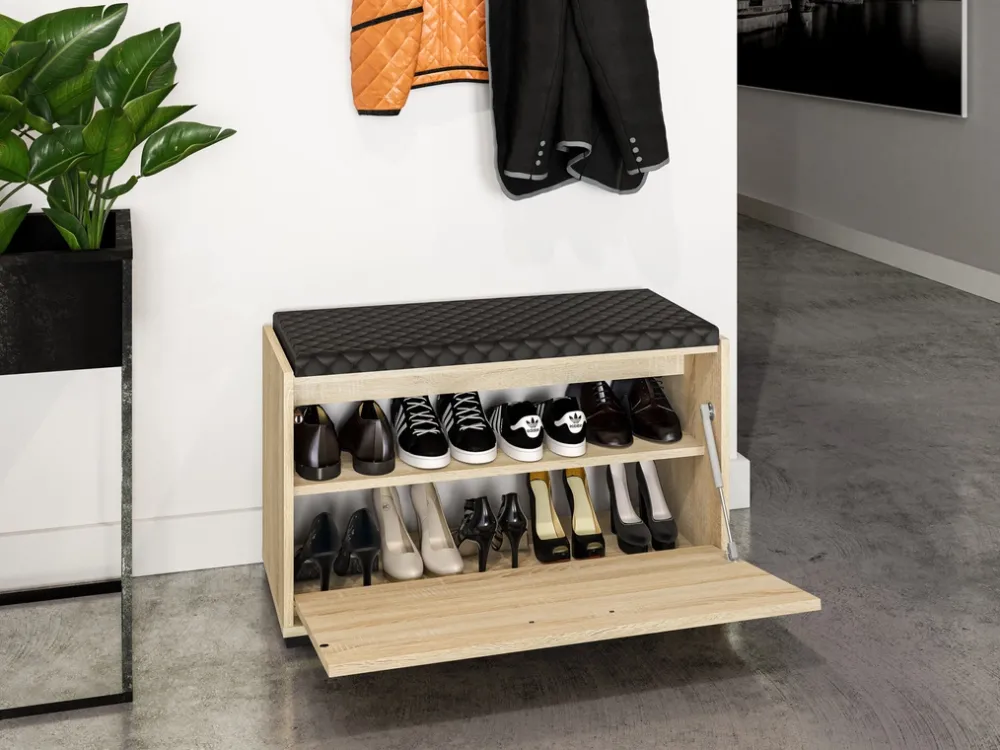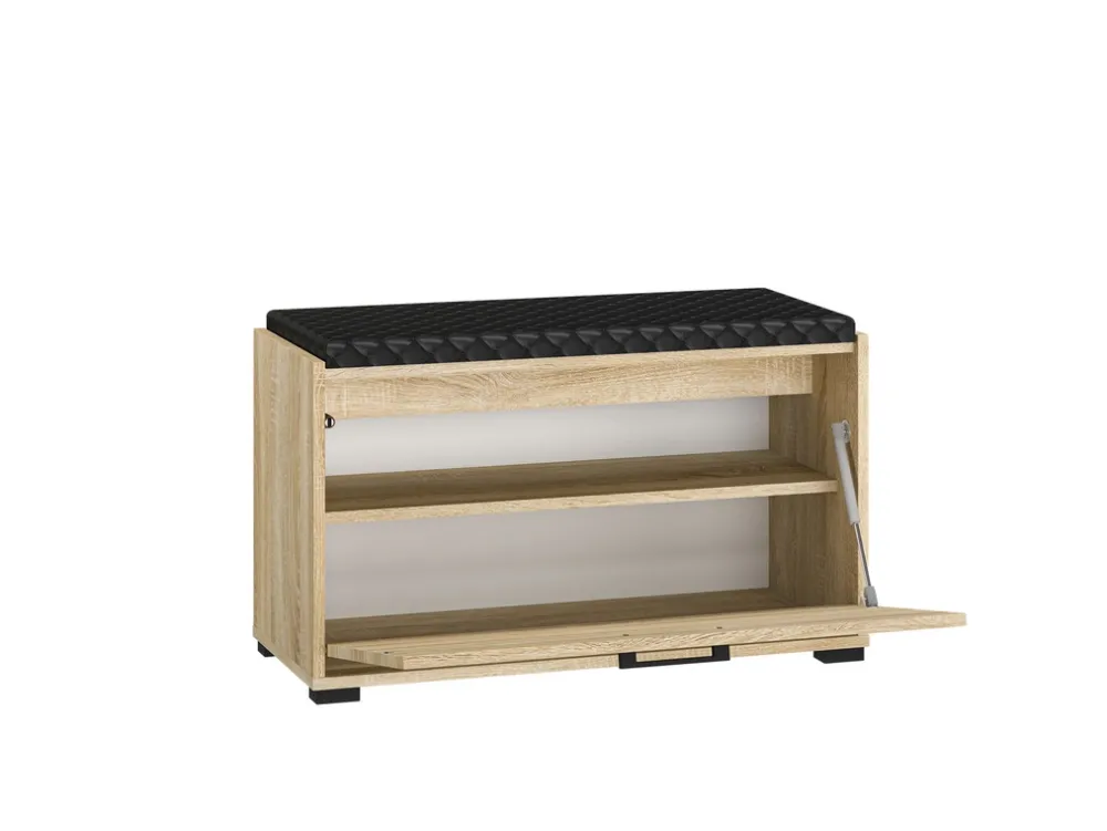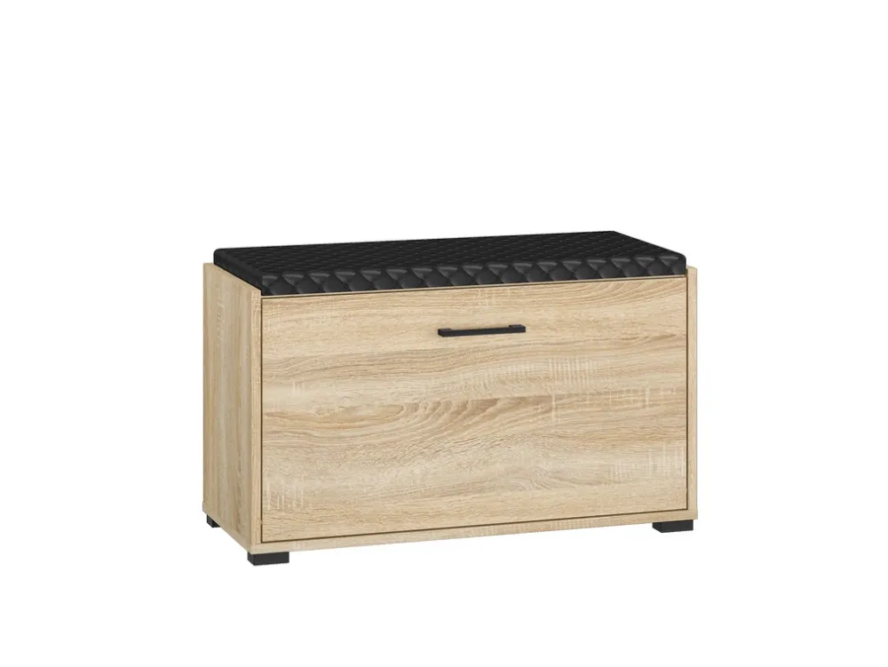 - Szafka na buty z tapicerowanym siedziskiem CARO posiada 80 cm szerokości. Za uchylnym frontem szafki znajduje się półka. Tapicerowane siedzisko zostało wykonane z ekoskóry w czarnym kolorze i wzorze kratki. Obrzeża wykończono okleiną ABS.
