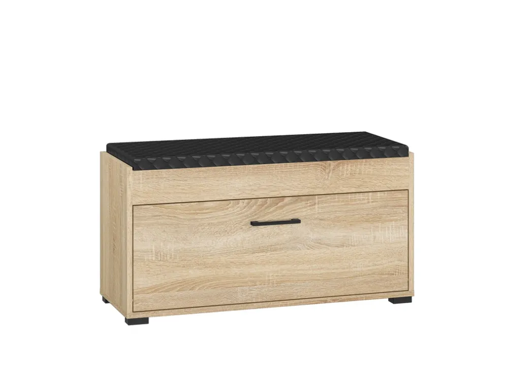 - Szafka na buty CARO posiada 90 cm szerokości, które pozwalają na przechowanie wielu par butów. Szafka została wyposażona w uchylny front za którym znajduje się półka. Siedzisko zostało wykończone czarną ekoskórą we wzorze kratki.