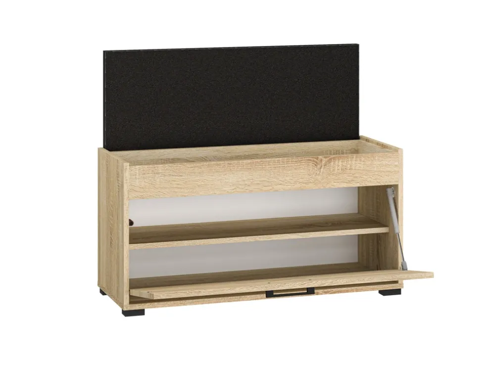 Pod siedziskiem znajduje się uchylny front, który kryje przestronną półkę na buty. Dzięki temu rozwiązaniu Twoje obuwie będzie zawsze uporządkowane i łatwo dostępne, a przedpokój zachowa schludny i zorganizowany wygląd. Uchylny mechanizm frontu umożliwia wygodne korzystanie z szafki, oszczędzając jednocześnie miejsce w przedpokoju.