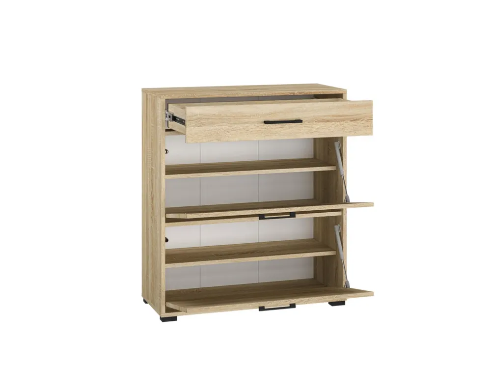 - Szafka na buty CARO posiada 80 cm szerokości. Szafka posiada szufladę u góry, pod którą znajdują się dwa uchylne fronty a za nimi cztery półki. Szafka została wykonana z płyty laminowanej 16 mm, obrzeża szafki wykończono okleiną ABS.