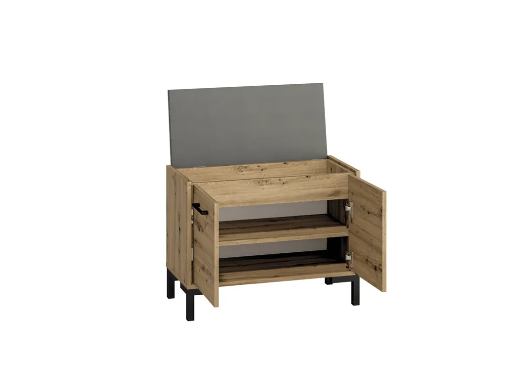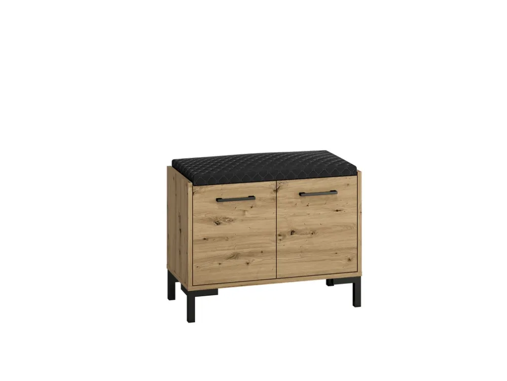 - Elegancka szafka na buty z tapicerowanym siedziskiem NEVIO wykonana z płyty laminowanej. Krawędzie zabezpieczone okleiną ABS. Posiada czarne nogi i uchwyty wykonane z tworzywa sztucznego. Pod siedziskiem znajduje się dodatkowy schowek.