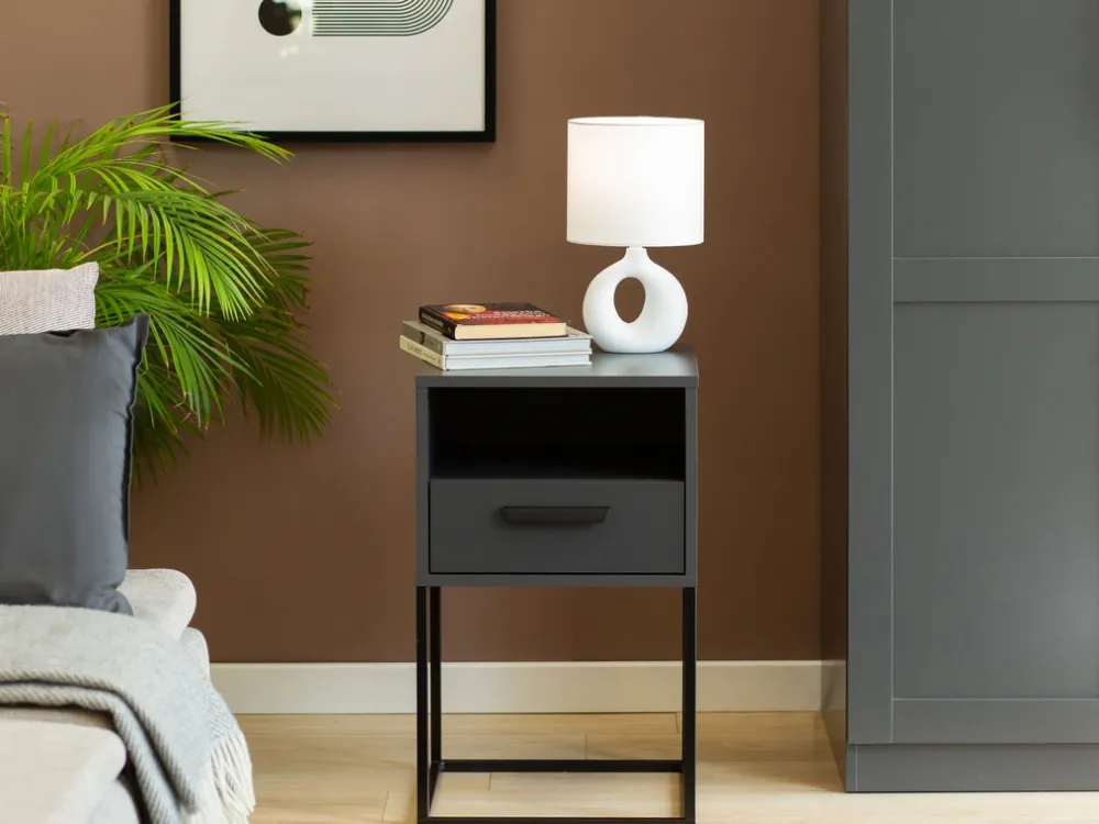 - Szafka nocna z szufladą i półką – wygodne miejsce na przechowywanie najpotrzebniejszych drobiazgów
