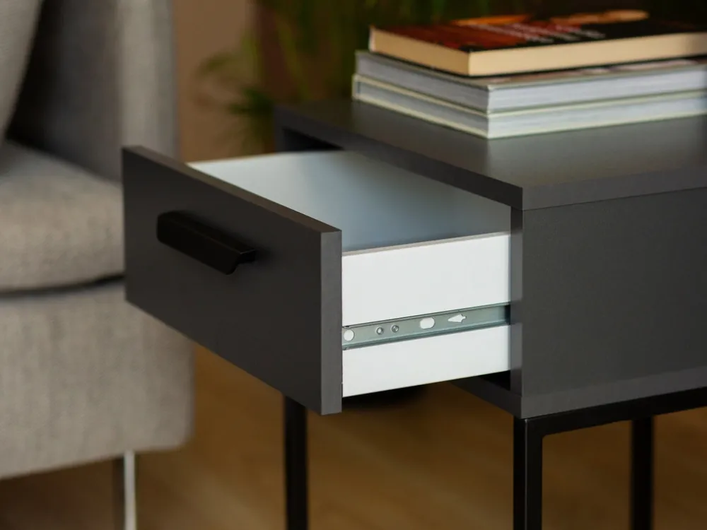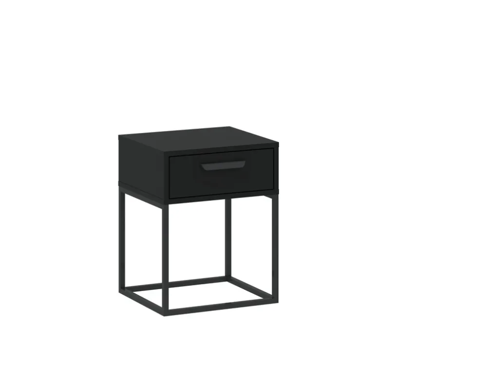 - Czarna szafka nocna COTTA z szufladą na kulkowych prowadnicach i metalowymi nóżkami to nowoczesny dodatek do sypialni. Idealna do wnętrz minimalistycznych i industrialnych – elegancka, kompaktowa i praktyczna na co dzień.