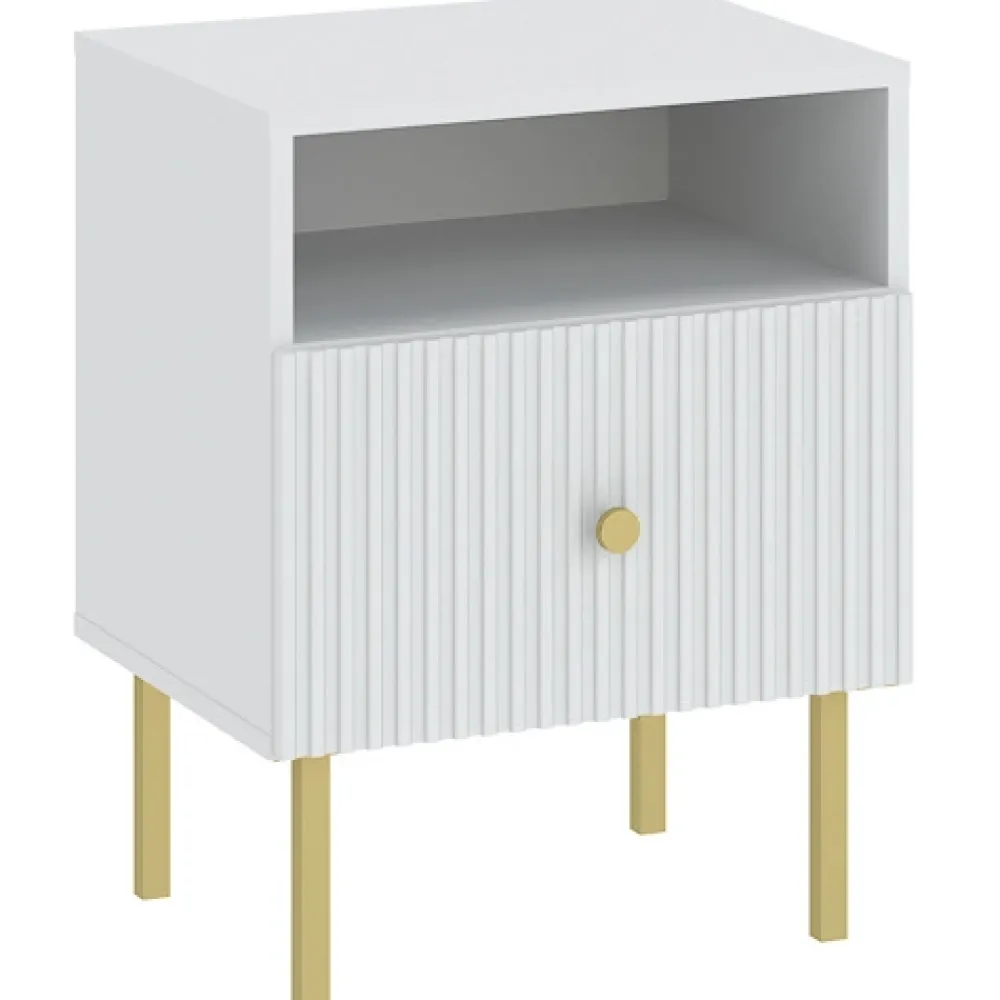 - Szafka nocna VALTEO łączy biały korpus ze złotymi akcentami. Wyposażona w szufladę i półkę, idealnie sprawdzi się przy łóżku. Nowoczesny design, eleganckie wykończenie i funkcjonalność w jednym – świetny wybór do każdej sypialni.
