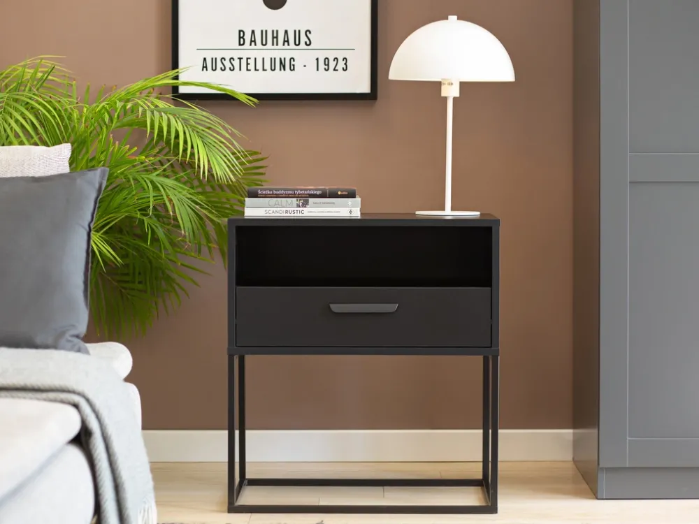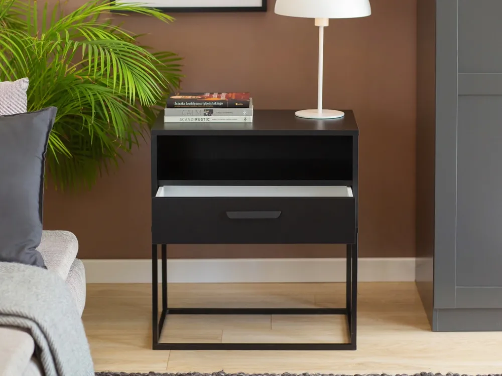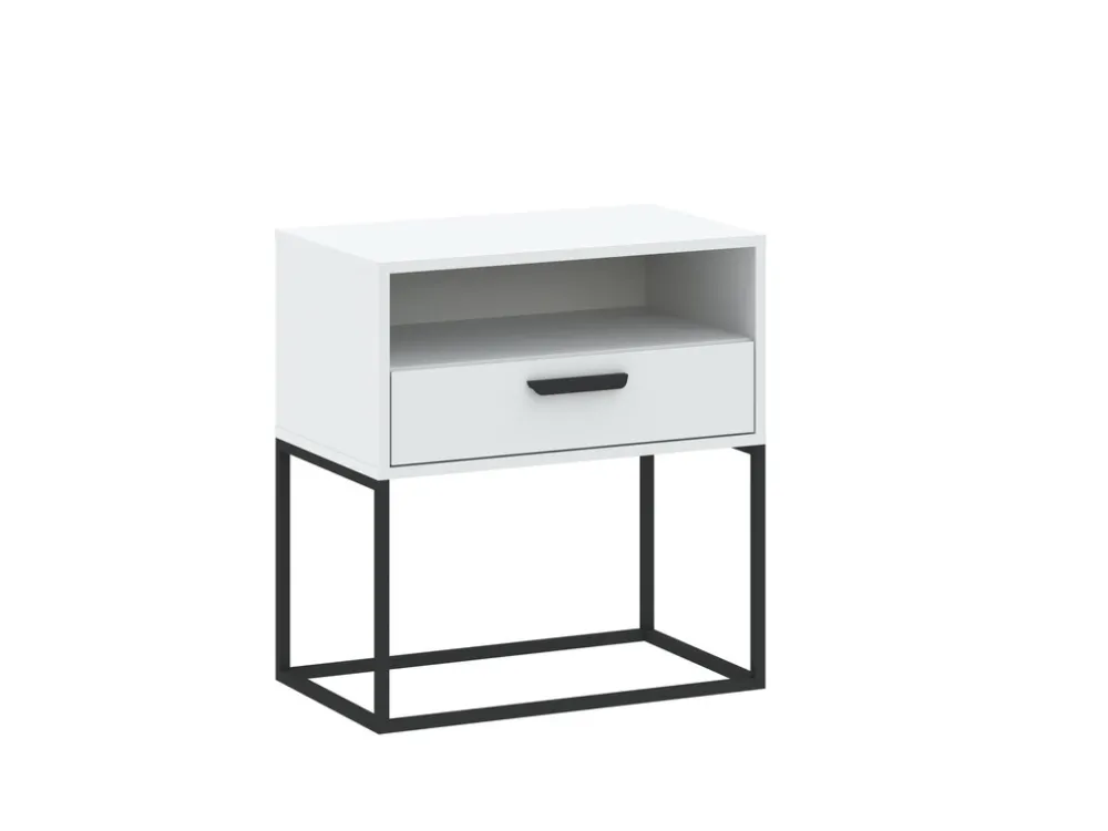- Szafka nocna COTTA z półką i szufladą to elegancki, biały mebel z czarnymi metalowymi nóżkami. Idealna do sypialni – oferuje praktyczne miejsce na drobiazgi i pasuje do nowoczesnych oraz klasycznych aranżacji wnętrz.