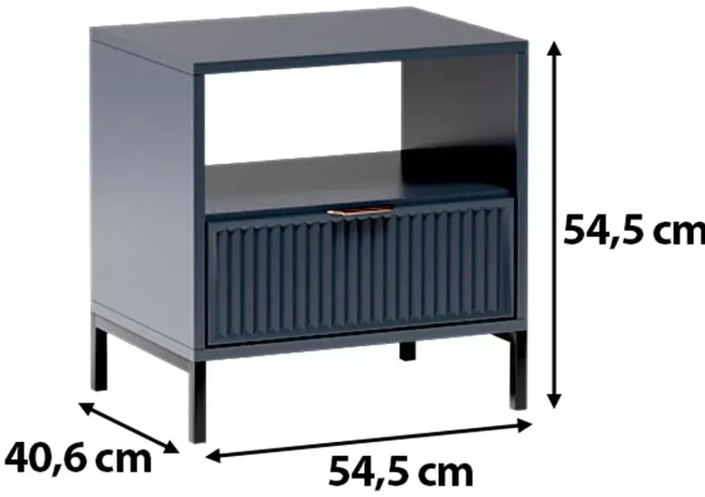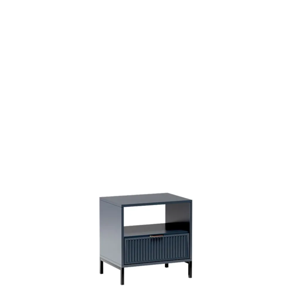 - Przywitaj dzień z naszą elegancką szafką nocną LATINA w kolorze indigo. Wyposażona w jedną szufladę z ryflowanym frontem, podkreśla swój styl. Otwarta półka nad szufladą dodaje funkcjonalności, sprawiając, że ta szafka nocna jest bardzo praktyczna.