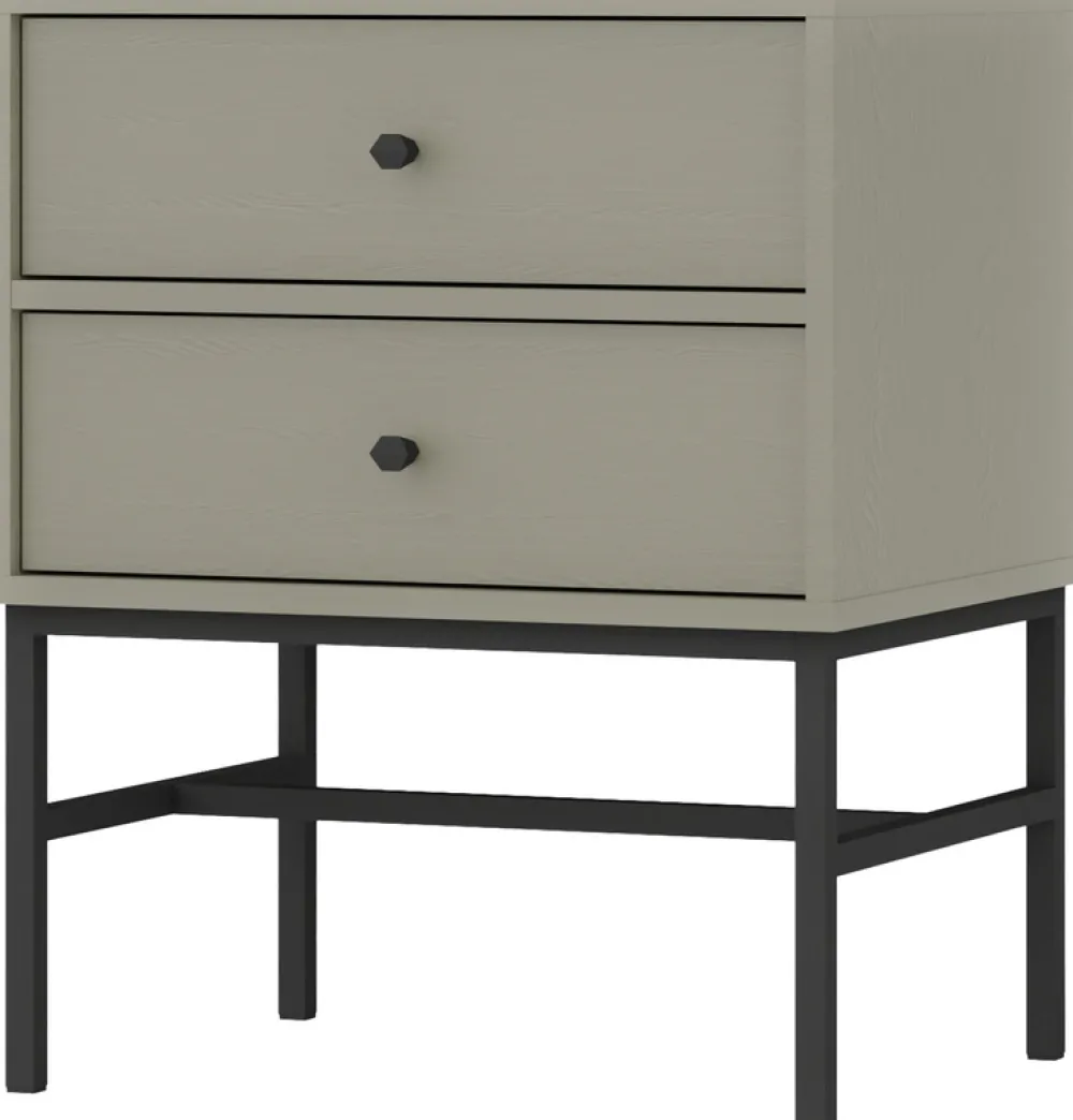 Nowoczesna szafka nocna z dwoma szufladami osadzonymi na prowadnicach kulkowych, stabilnym metalowym stelażem oraz eleganckimi metalowymi uchwytami to idealny wybór dla osób ceniących sobie funkcjonalność i styl. Obrzeża wykończone okleiną ABS zapewniają dodatkową trwałość i estetykę. Ten mebel to doskonałe uzupełnienie każdej sypialni, oferując nie tylko praktyczne rozwiązania, ale również wyjątkowy design.