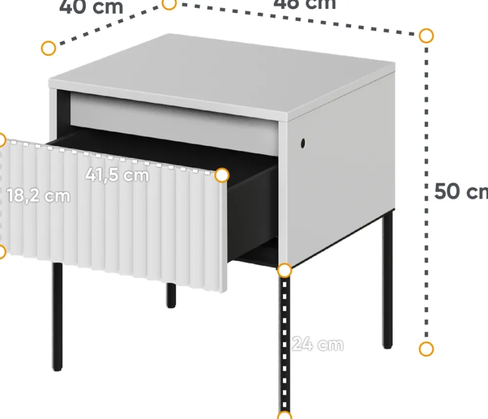 Poznaj wyjątkowy dodatek do Twojej sypialni – naszą nowoczesną, białą szafkę nocną TREND. Ta elegancka szafka o szerokości 46 cm jest doskonałym rozwiązaniem dla tych, którzy pragną połączenia funkcjonalności z najnowszymi trendami w designie.